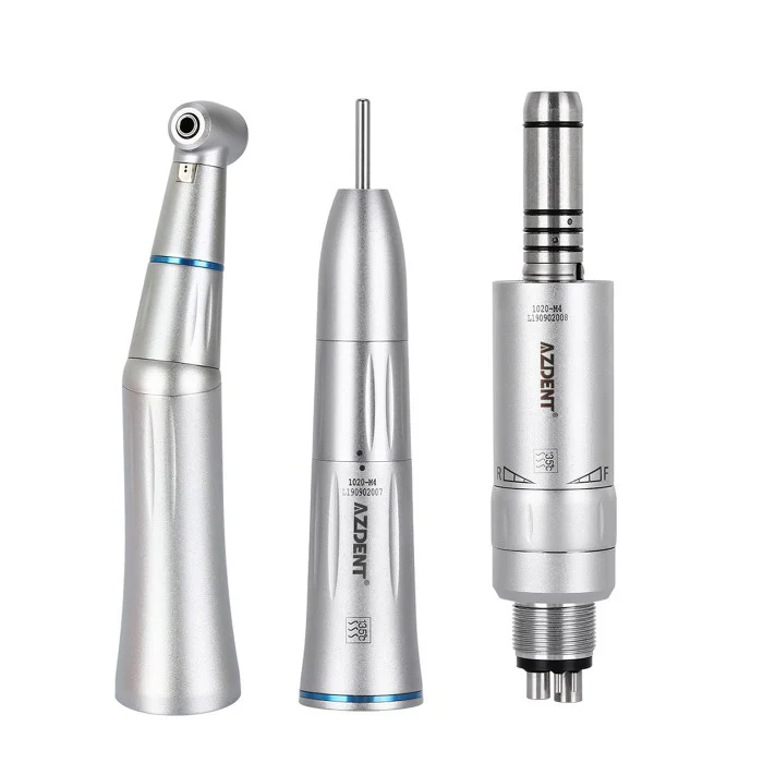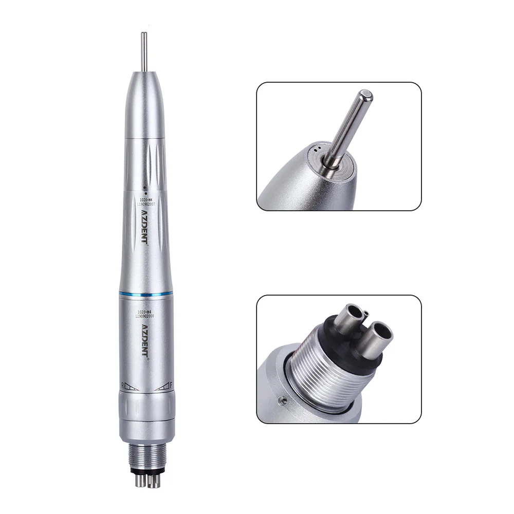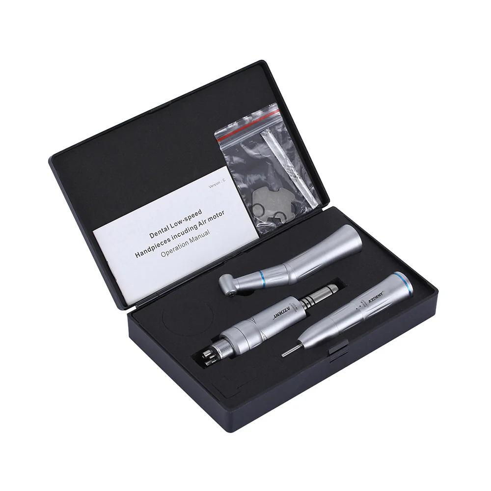 1:1 Low Speed Contra Angle & Straight Handpiece & 4 Holes Air Motor With Internal Water Kit. Includes: E-type 4 Holes Internal Water Air Motor, 1:1 Straight Nose cone Handpiece, and 1:1 Contra Angle With Push Button. Autoclavable to 135 ℃. Sturdy and Durable.