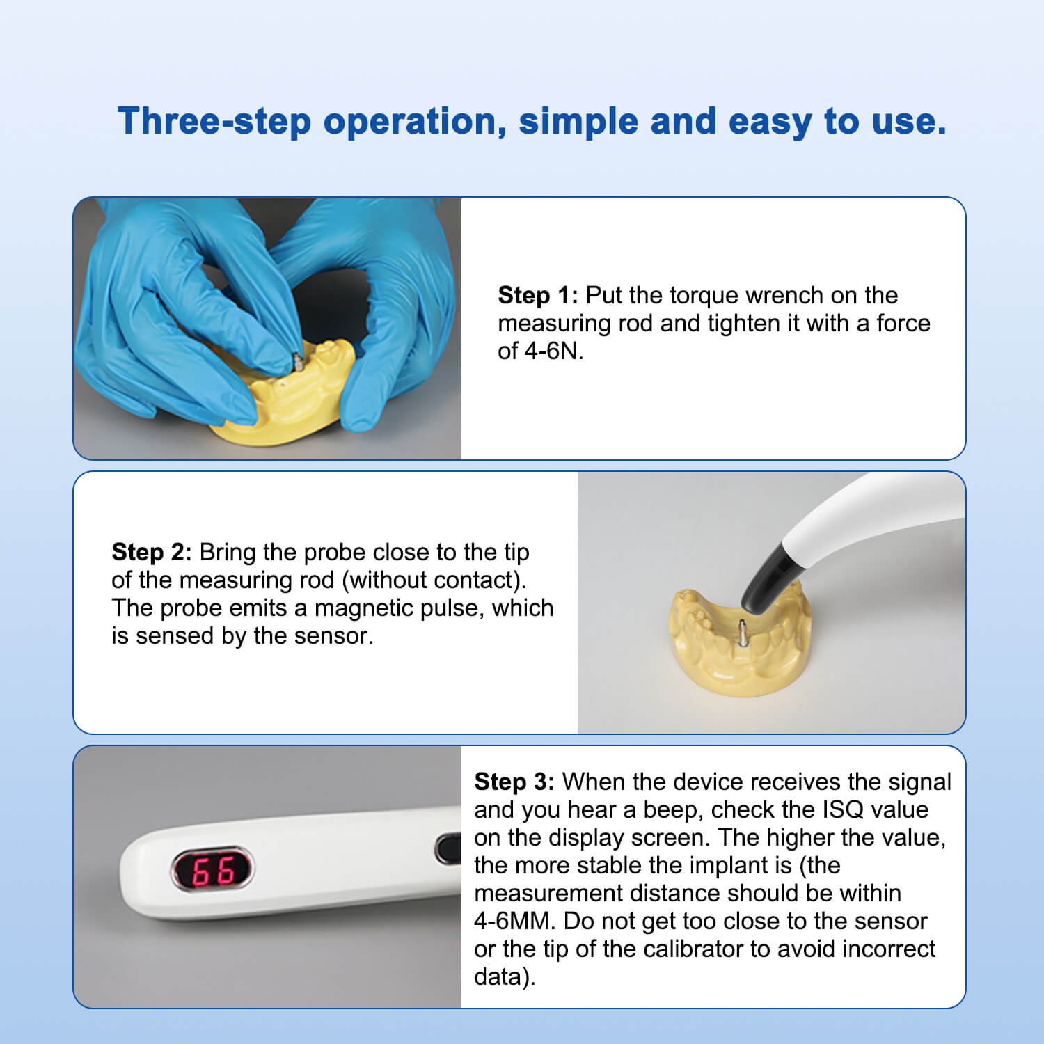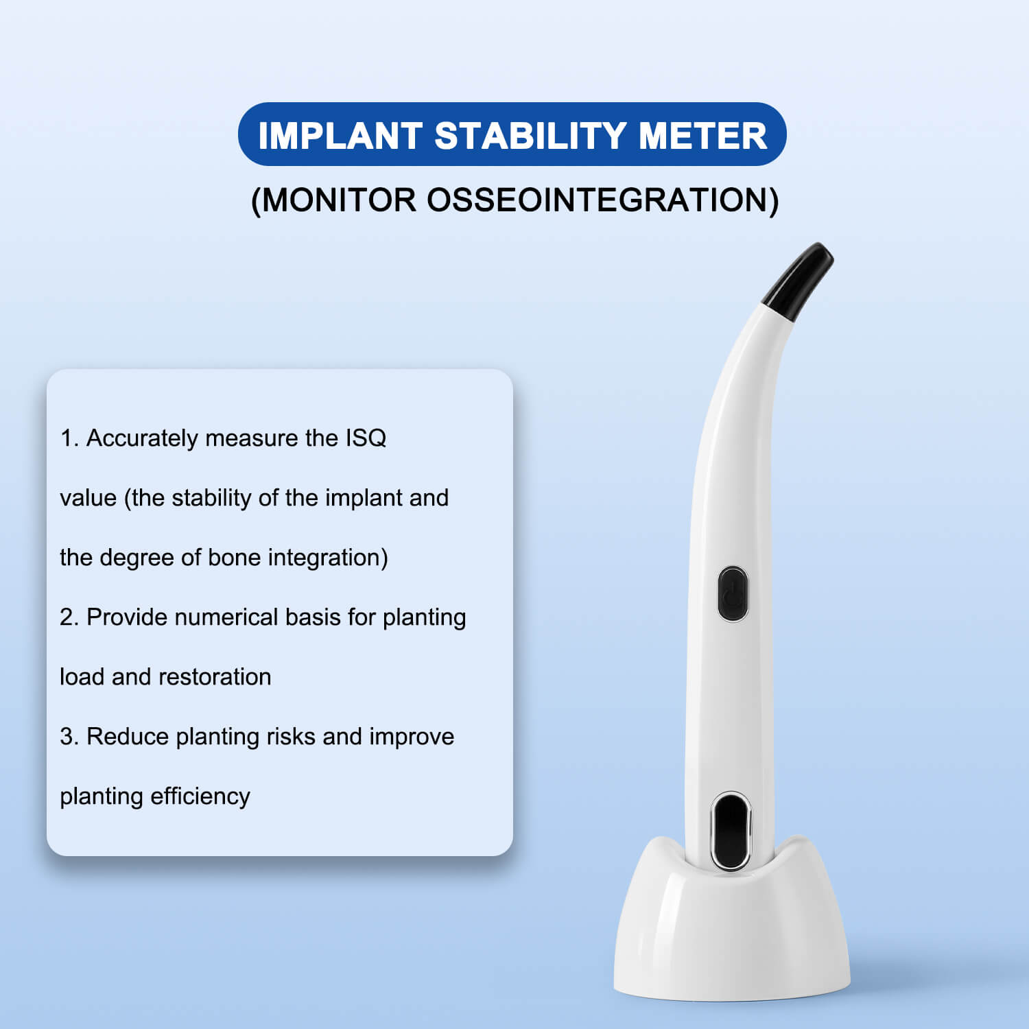 Dental Implant Stability Monitor ISQ Tester for Osseointegration Measurement. The implant stability monitor is only used to measure the stability of dental implants in the oral cavity or craniofacial region. It is a complete diagnostic system for assessing the stability of implants. It provides dentists with precise, consistent and reliable measurement data. By establishing a clinical database, it can better serve oral patients.