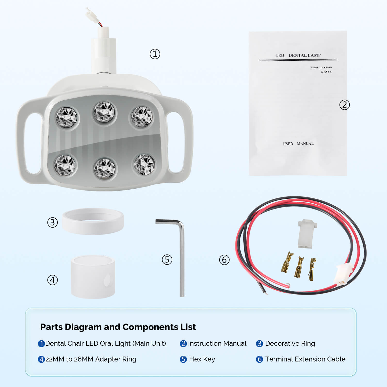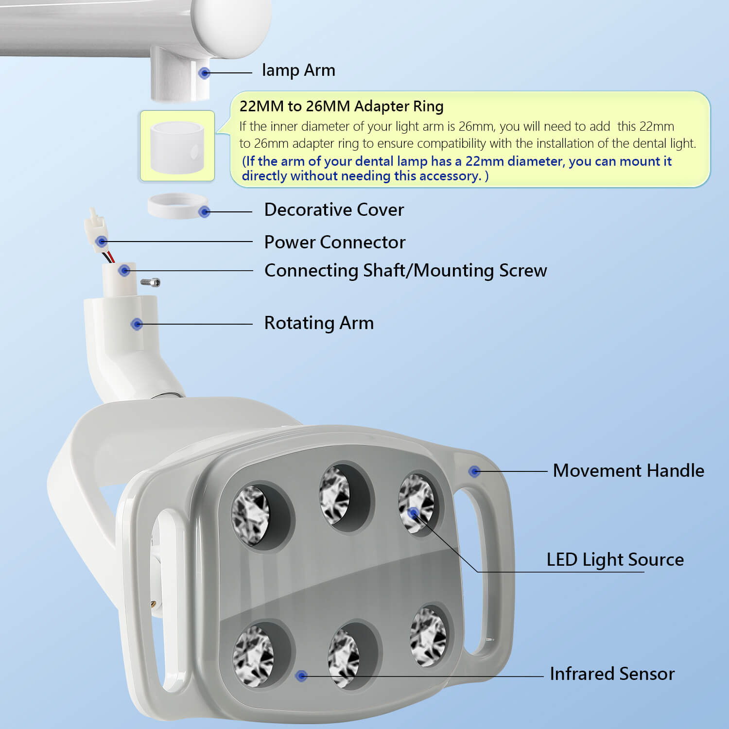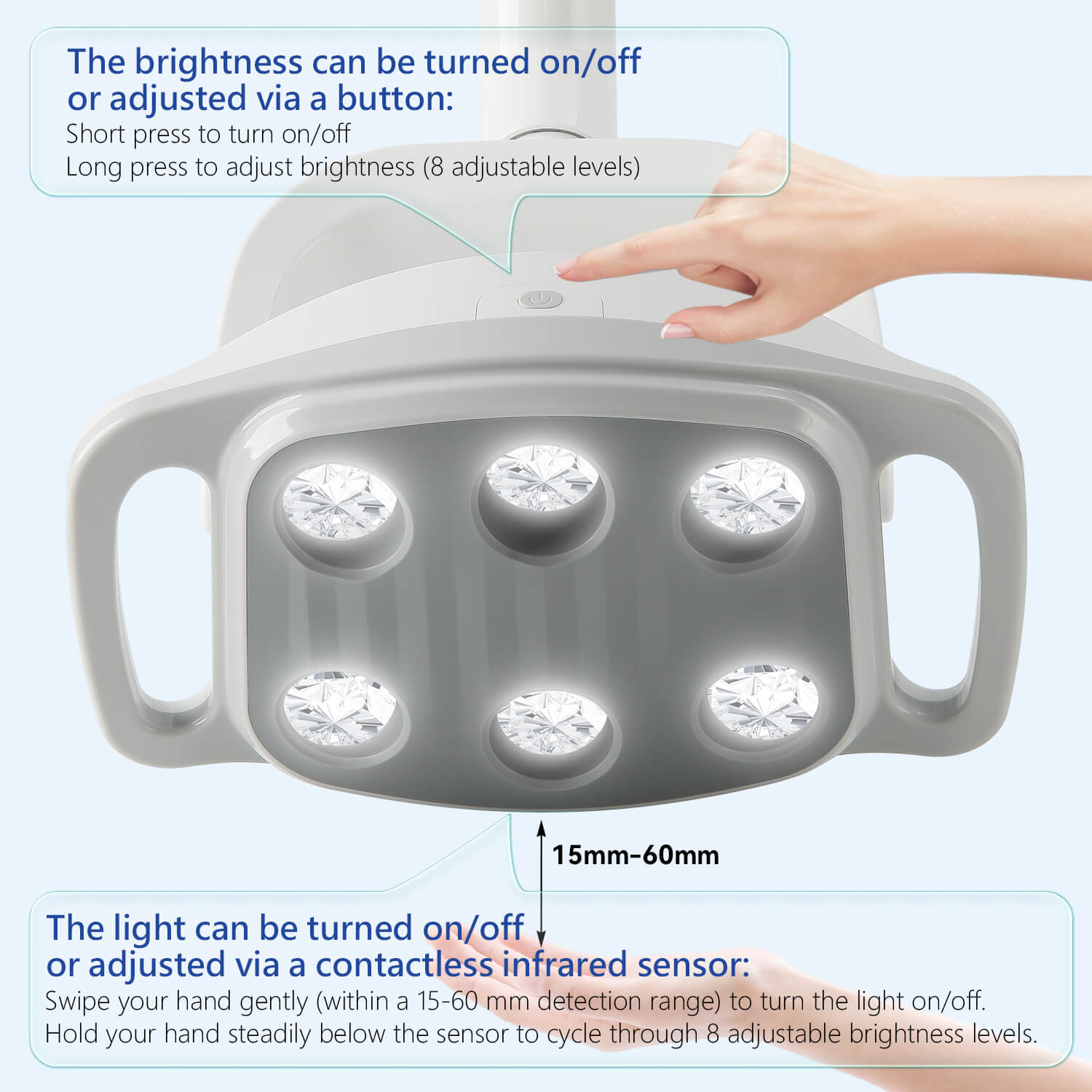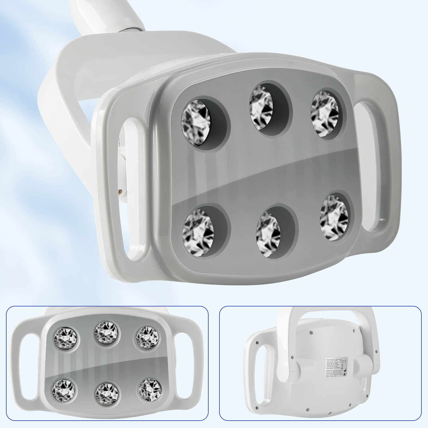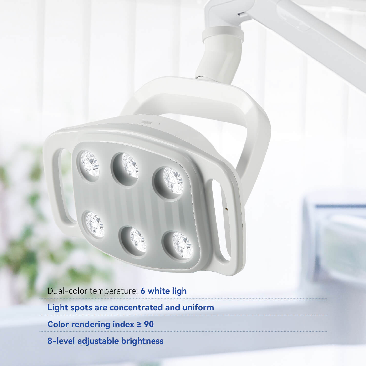 Dental LED Oral Light 9W for Unit Chair 6 White Lights. Infrared sensor switch energy-saving and convenient. Arbitrary angle adjustment. Lux: 8000-30000lux (distance spot 700mm). Color temperature:4500K. 8-level adjustable brightness.