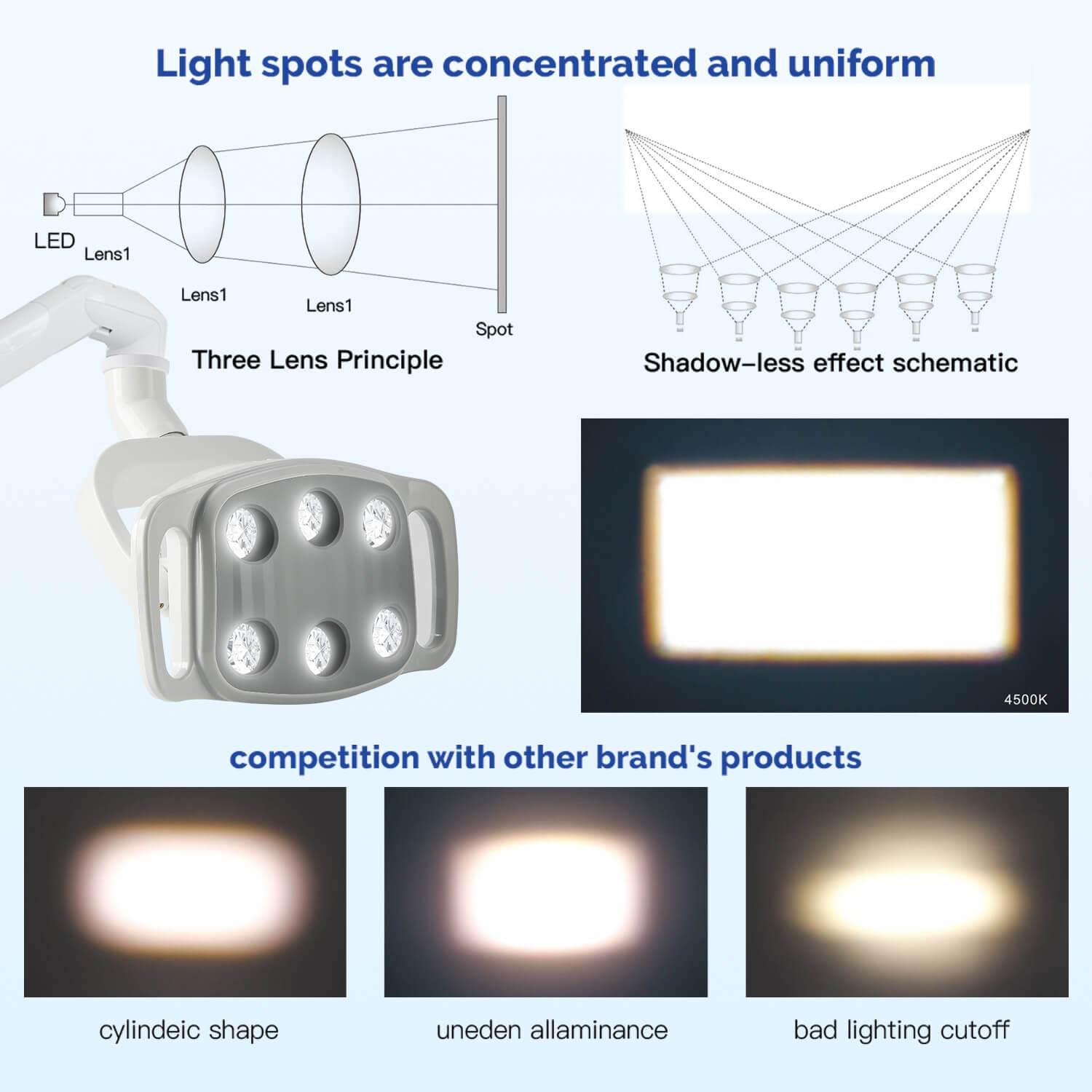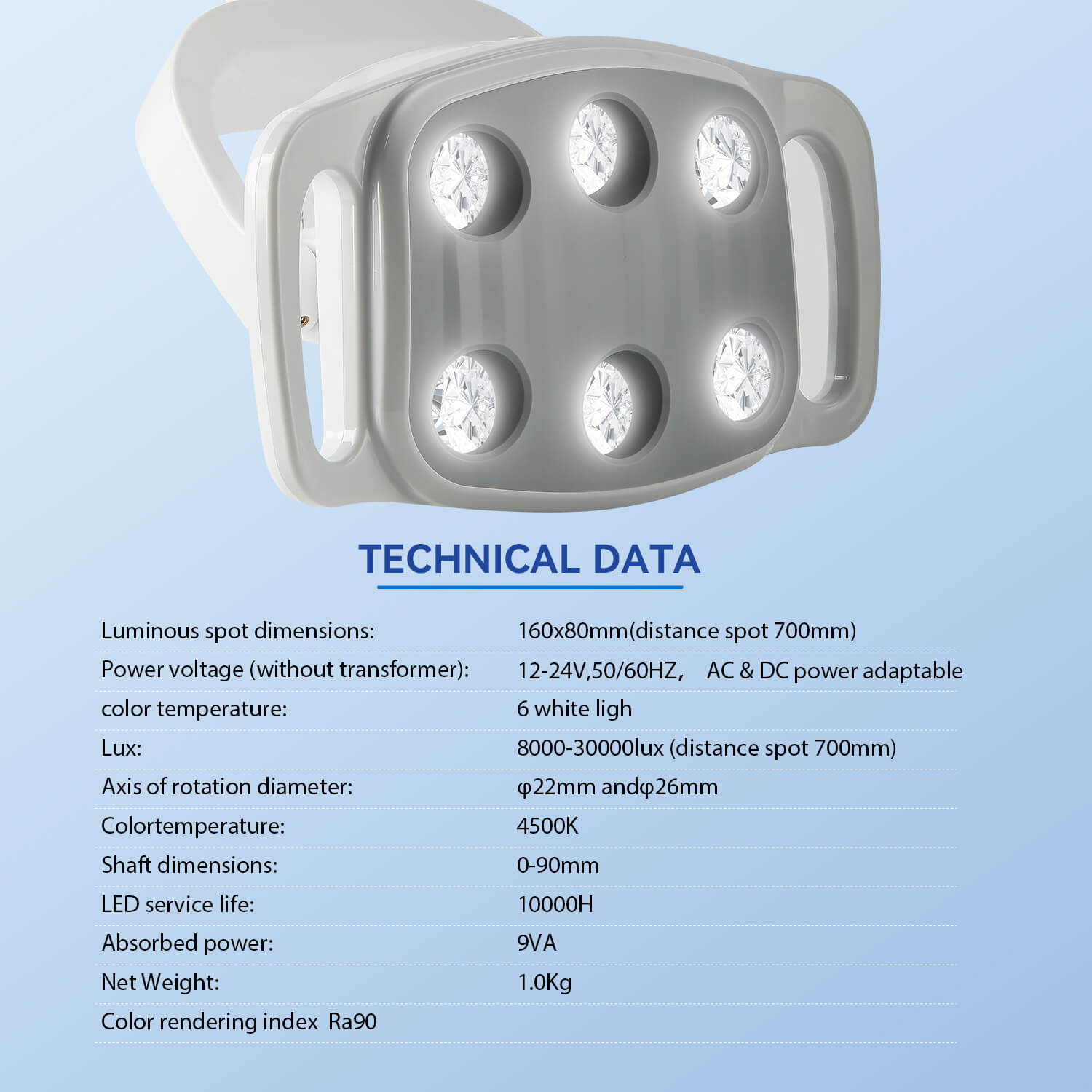 - Lux: >30000lux (distance spot 700mm)