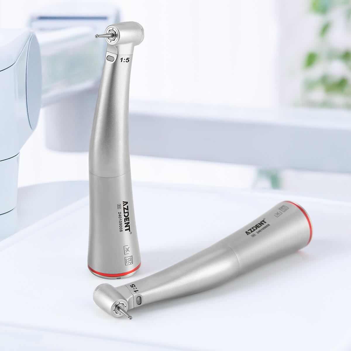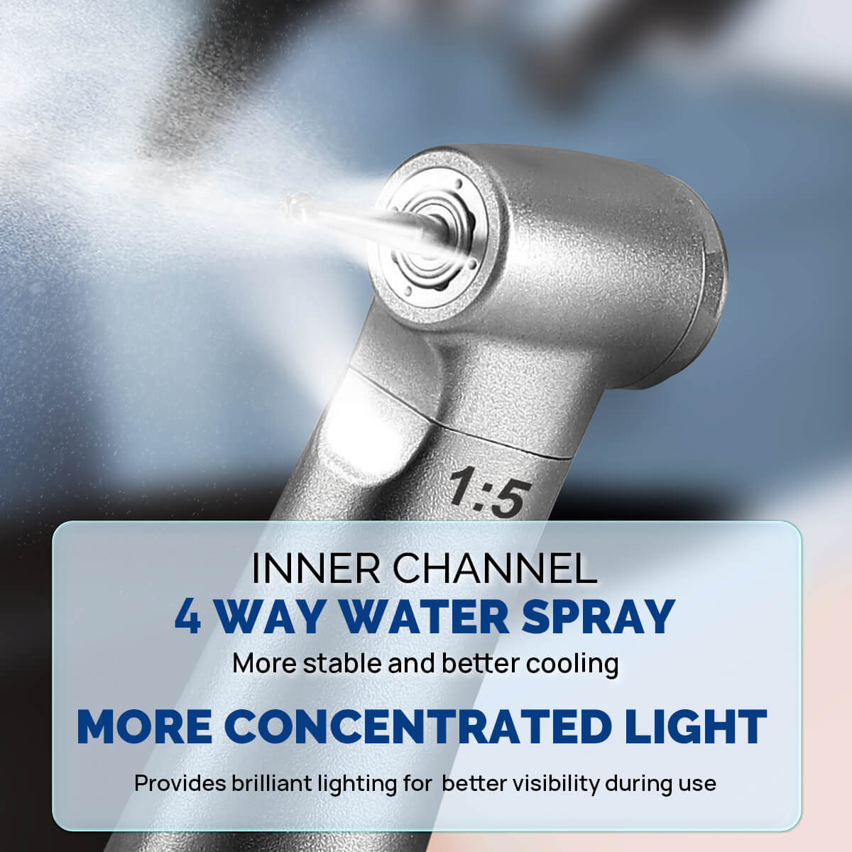 Dental Mini 1:5 Fiber Optic Increase Contra Angle Handpiece Internal Water Quattro Spray. Compatible with universal Fiber Optic E-Type Electric Motor. Optical fiber illumination, high brightness. Mini Head Speed-increasing Electric Handpiece. 316 Stainless steel body, wear resistant. Push button, quick and easy changing burs.