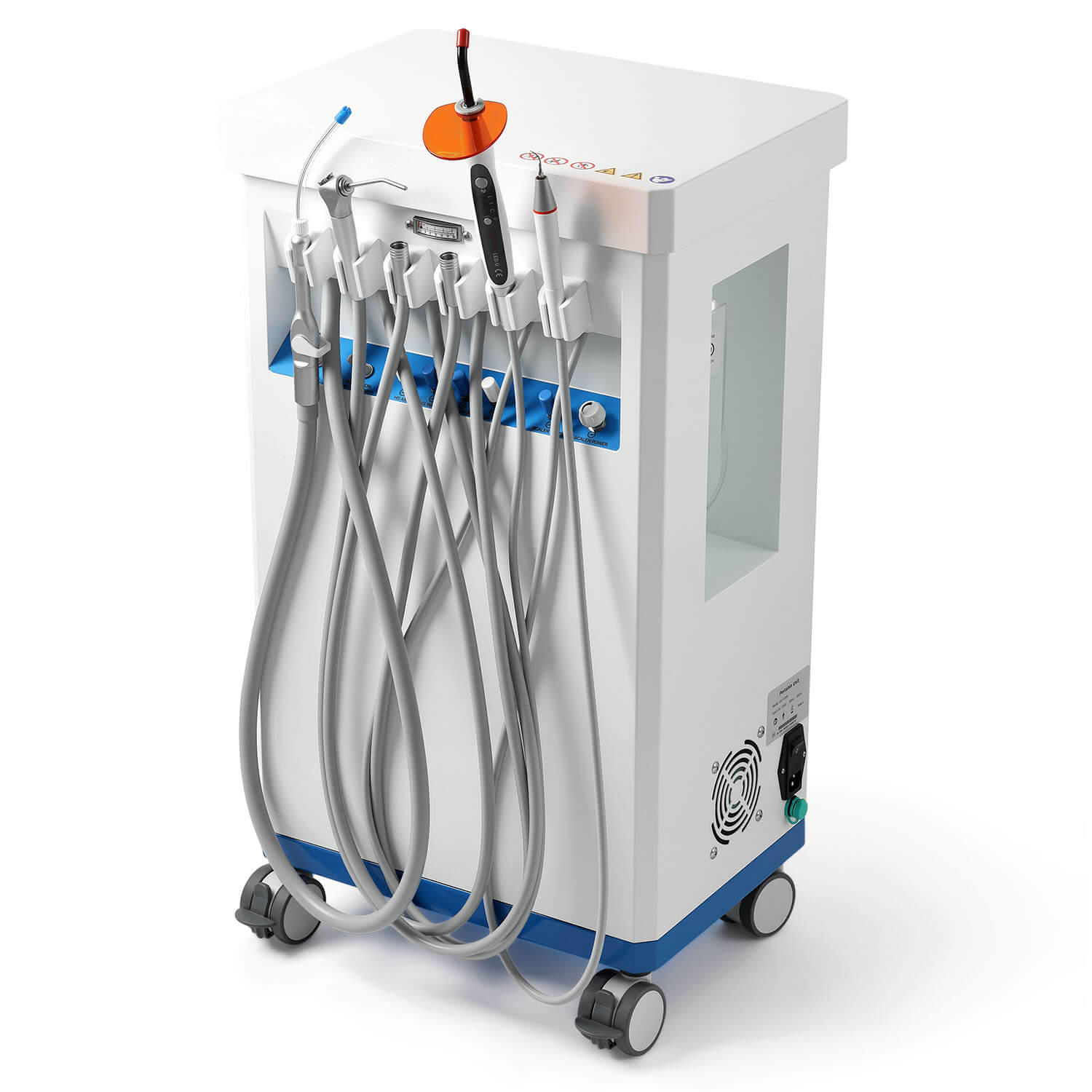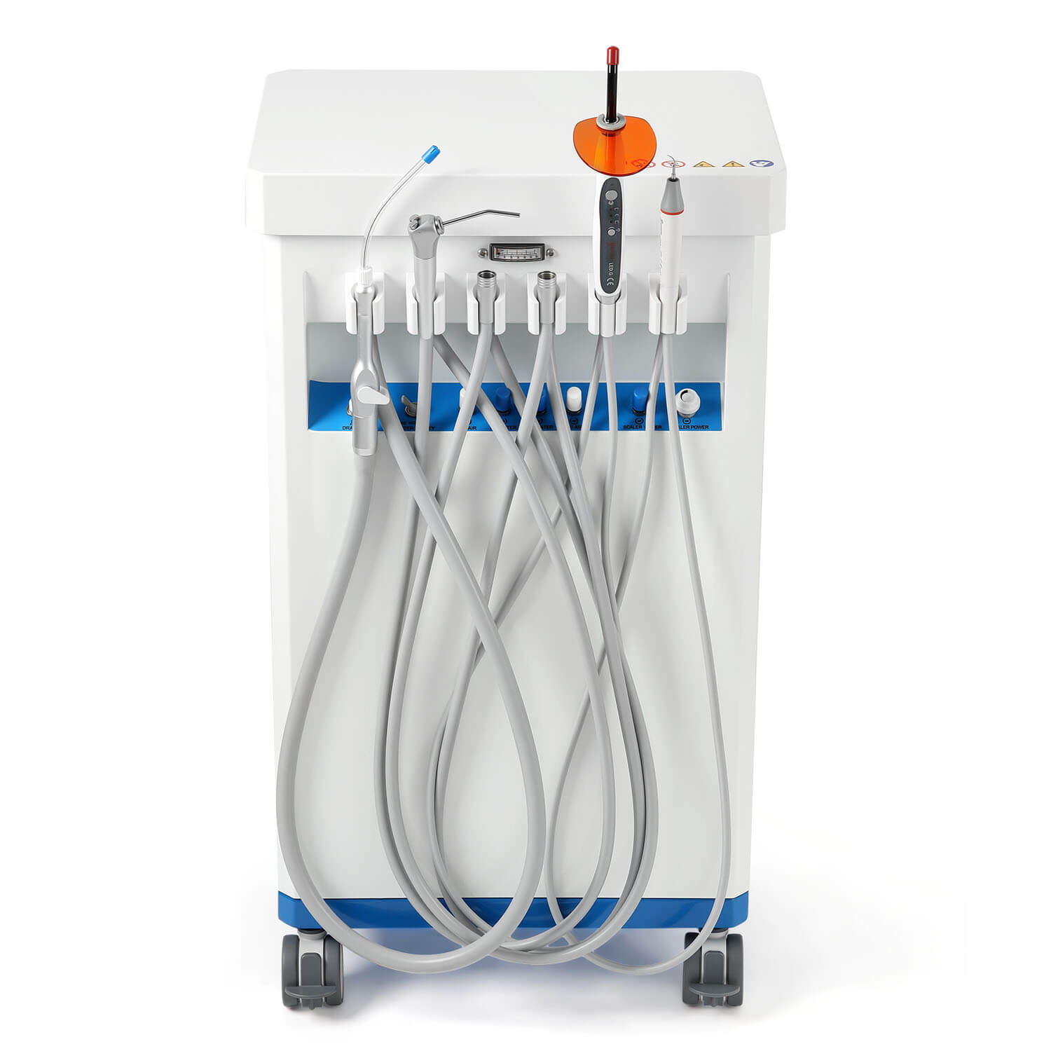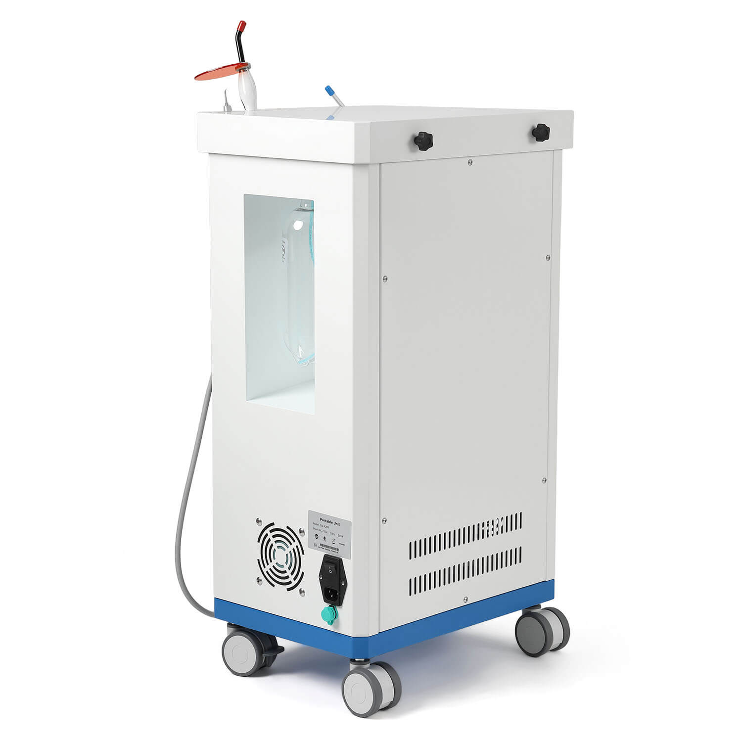 Dental Mobile Delivery Cart Unit 4 Holes with Curing Light and Scaler Handpiece. High quality aluminum alloy material. With a durable cabinet, light weight. Suction Control Knob: Adjusts suction strength between strong and gentle settings. Thickened saliva jet, with adjustable and powerful suction.