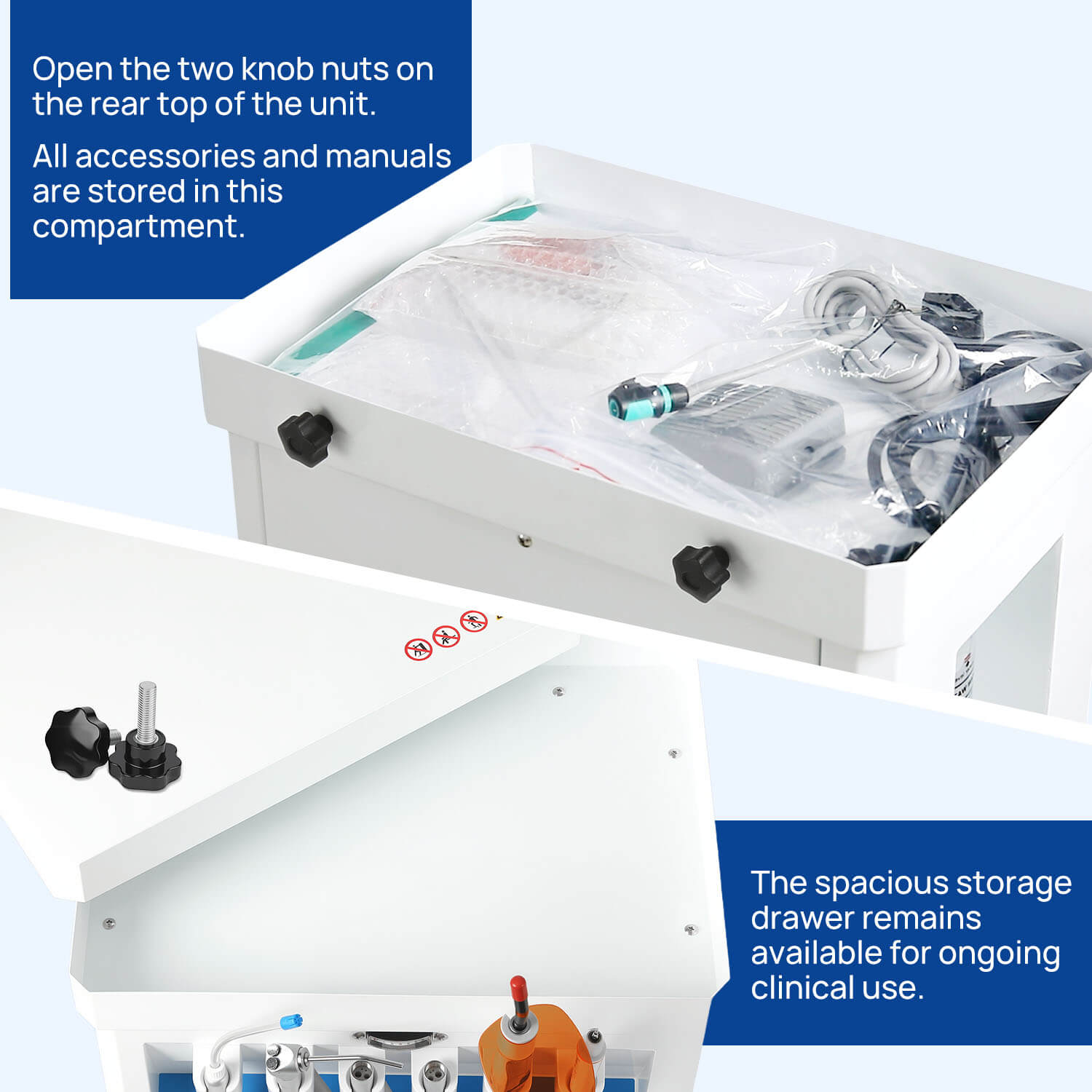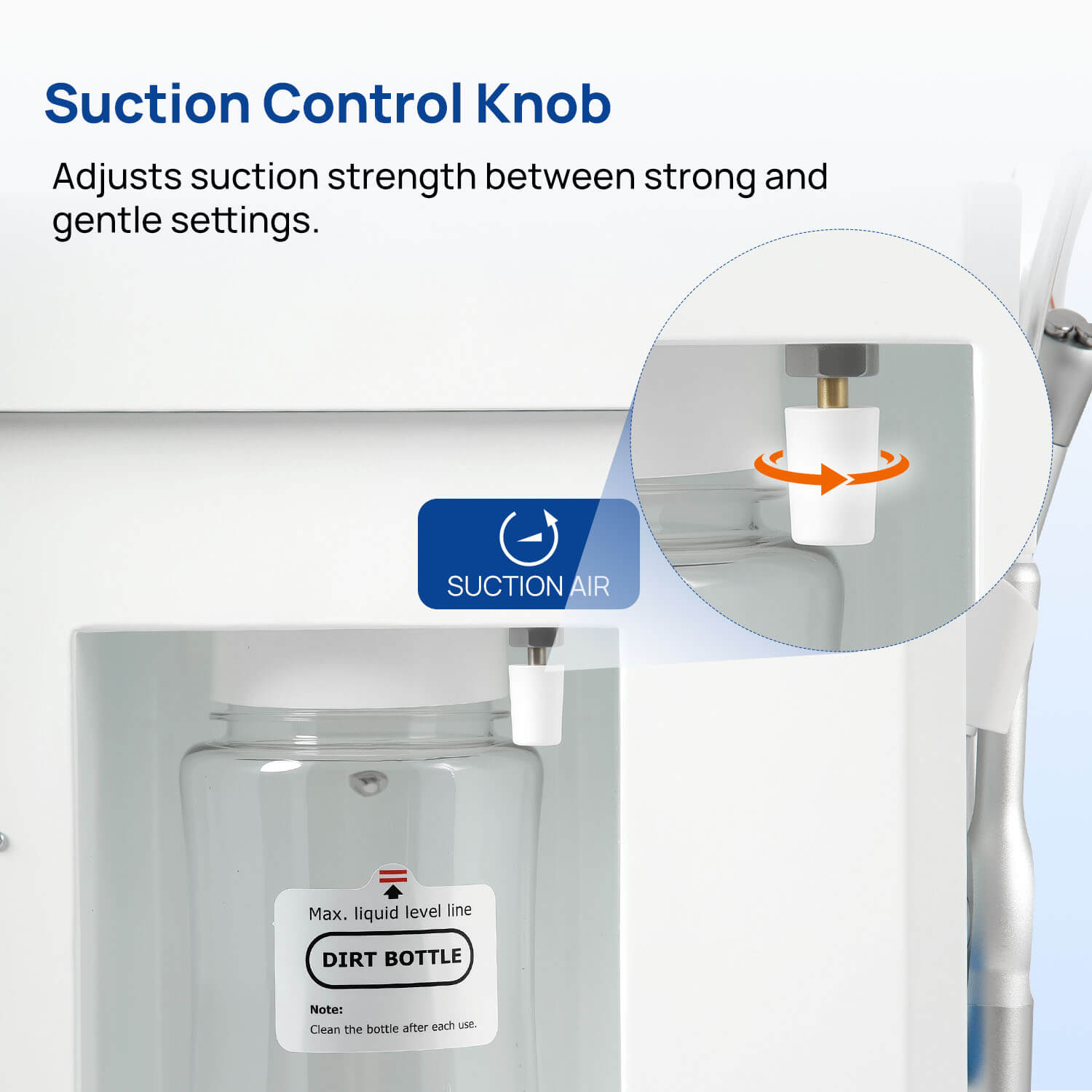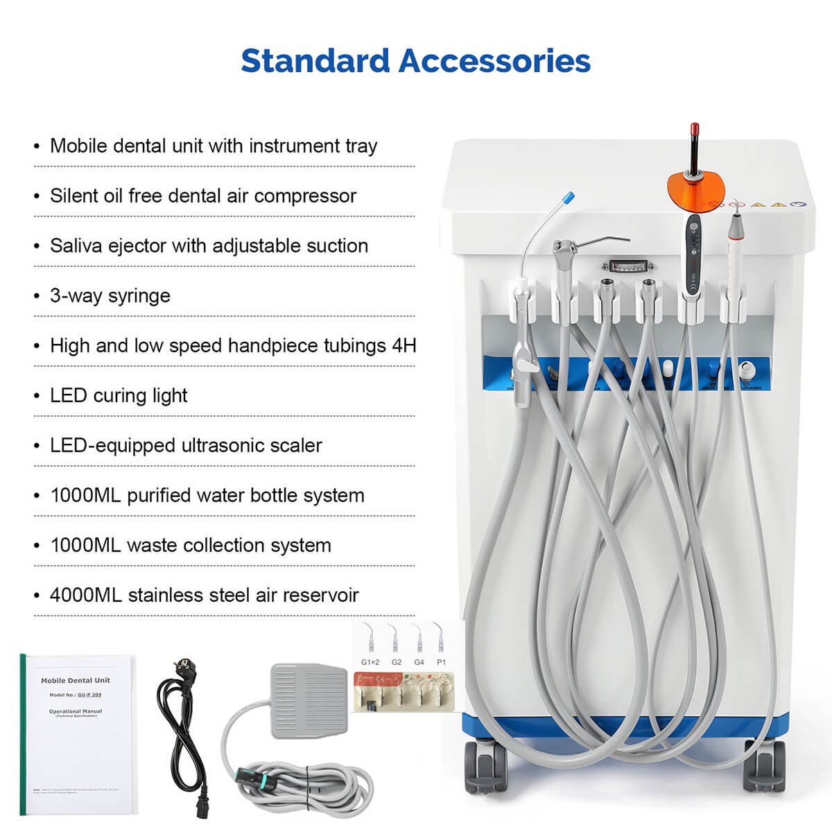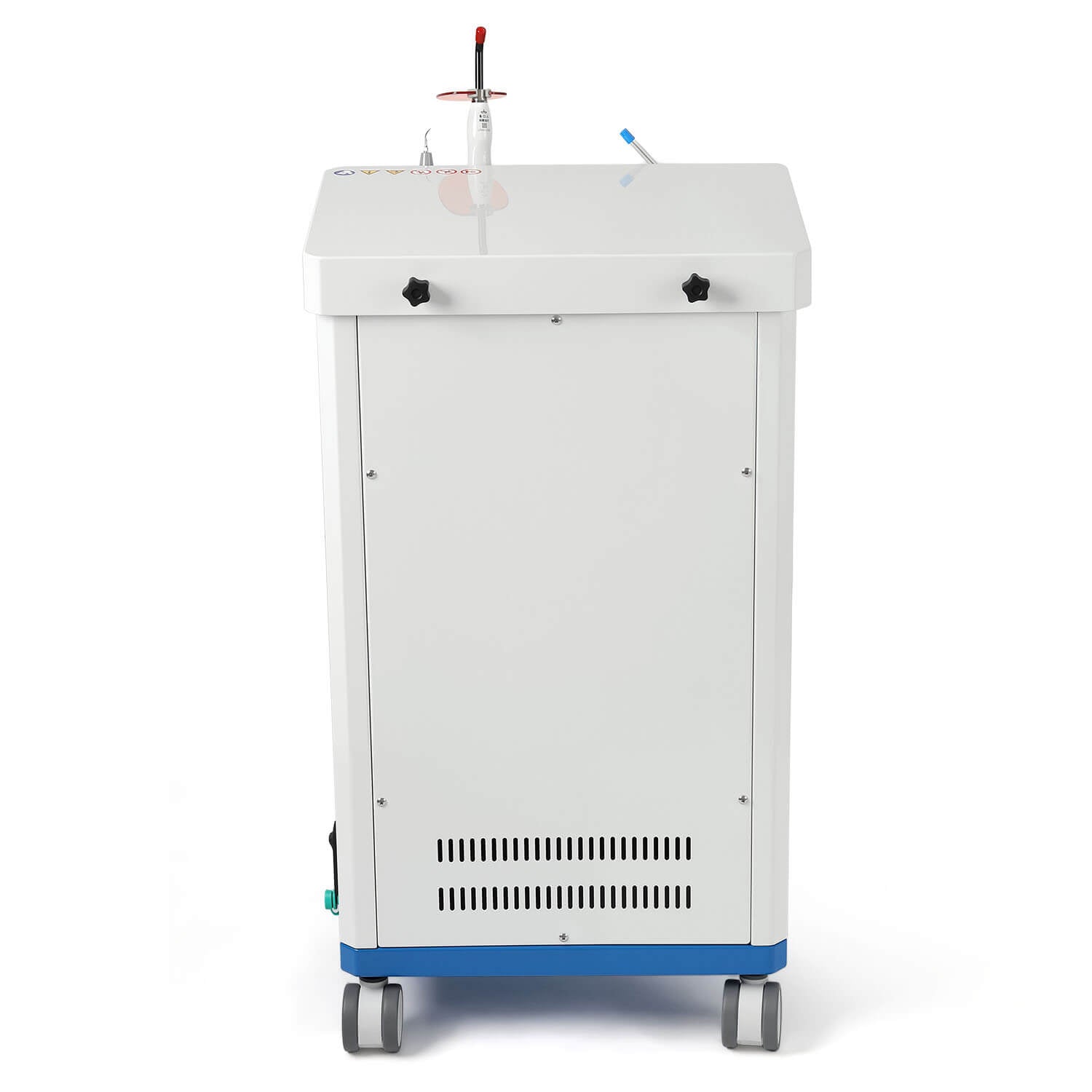 Dental Mobile Delivery Cart Unit 4 Holes with Curing Light and Scaler Handpiece. High quality aluminum alloy material. With a durable cabinet, light weight. Suction Control Knob: Adjusts suction strength between strong and gentle settings. Thickened saliva jet, with adjustable and powerful suction.