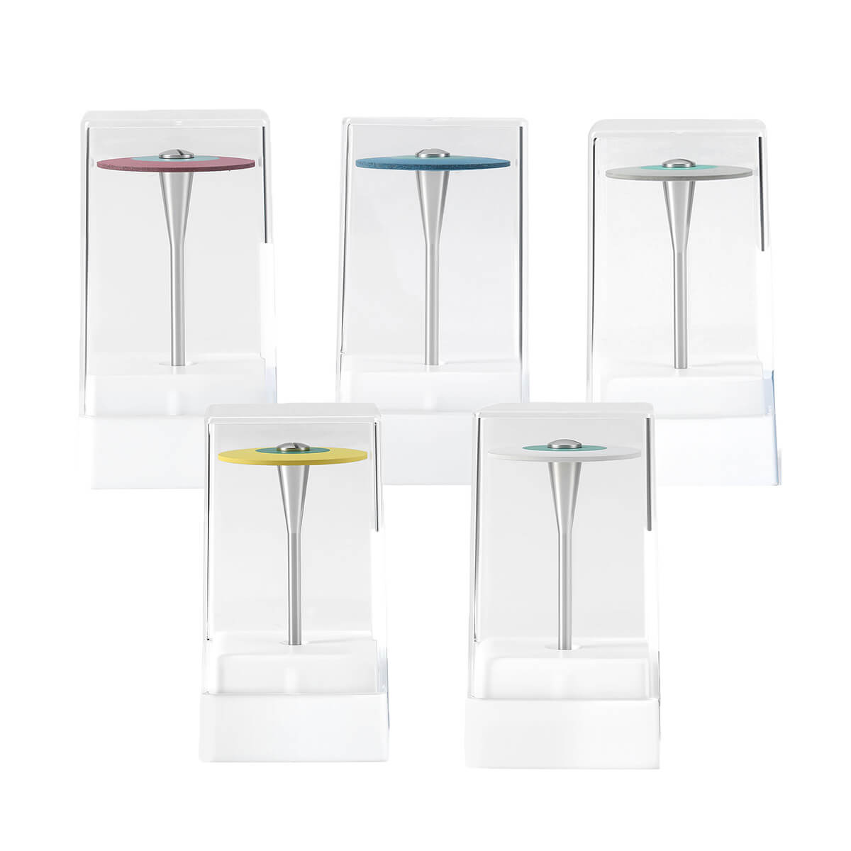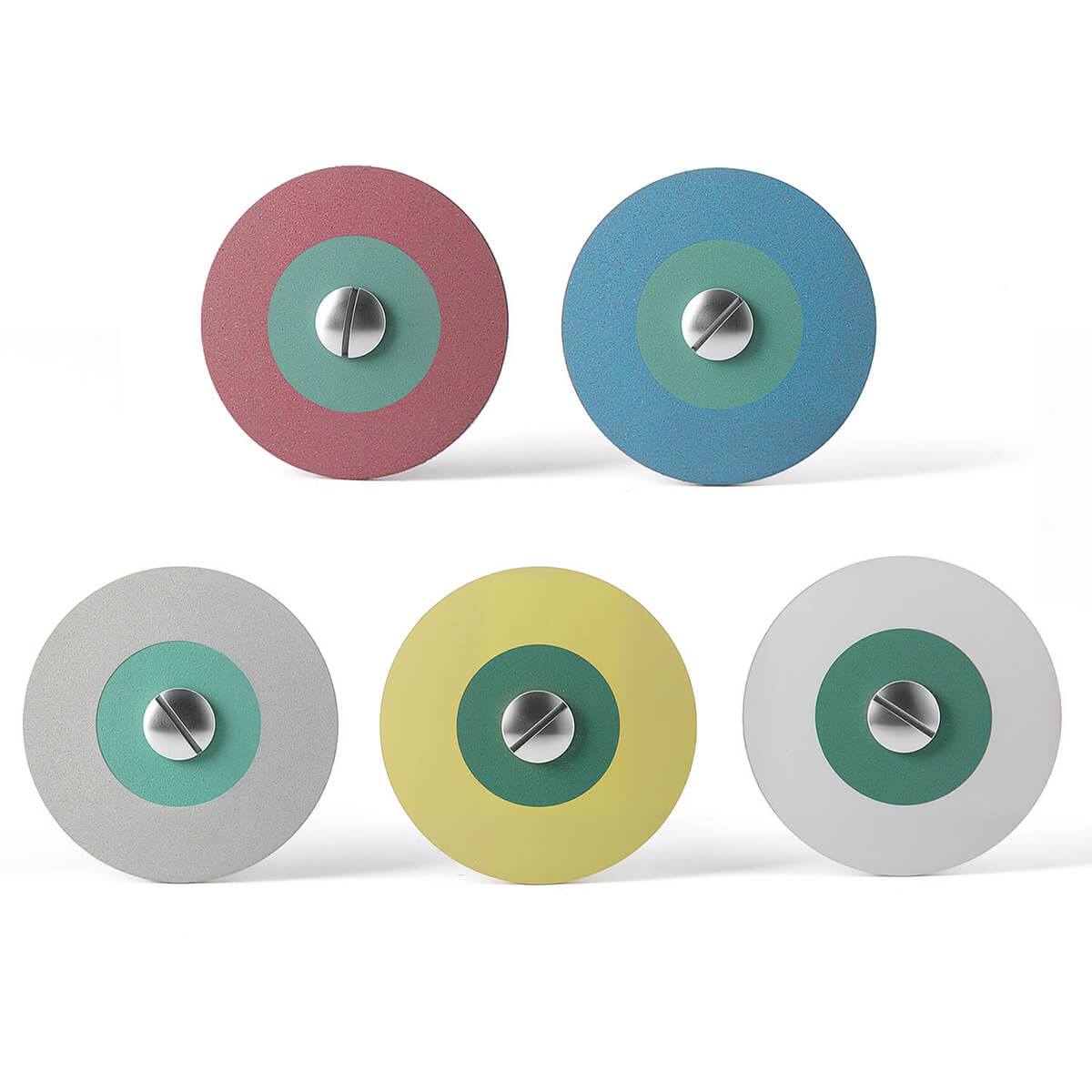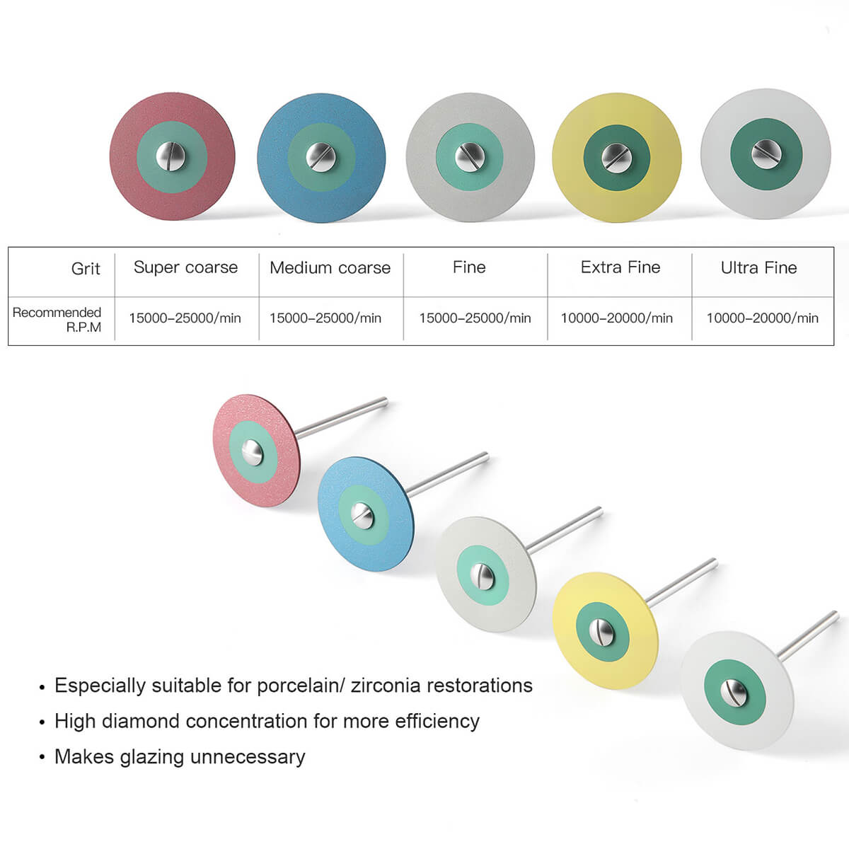 Dental Polishing Rubber Diamond Wheel Disc 26mm. 1pc/Box. 5 Models. Super coarse, Medium coarse, Fine, Extra Fine, Ultra Fine. Recommended R.P.M is 15,000-25,000/min and 10,000-20,000/min. Especially suitable for porcelain/ zirconia restorations. High diamond concentration for more efficiency.