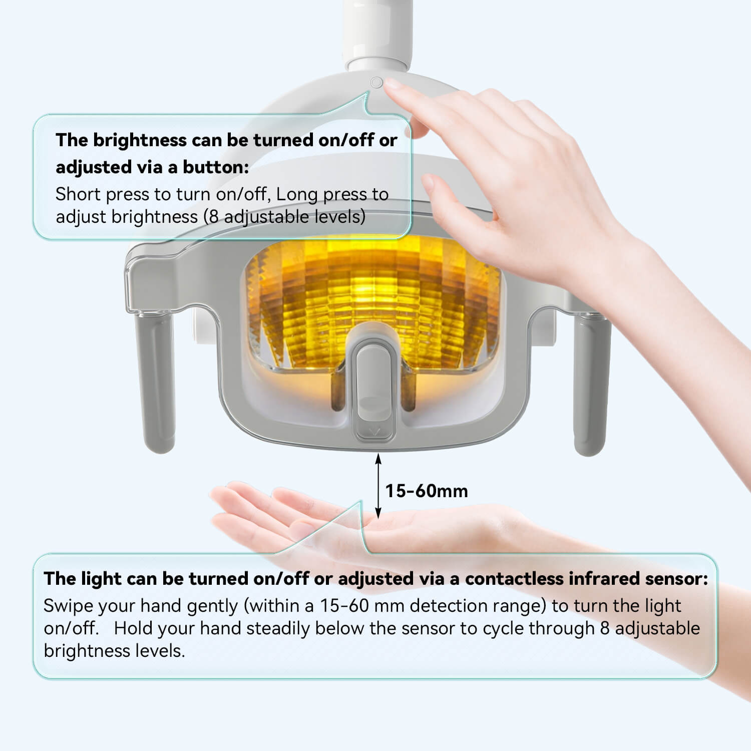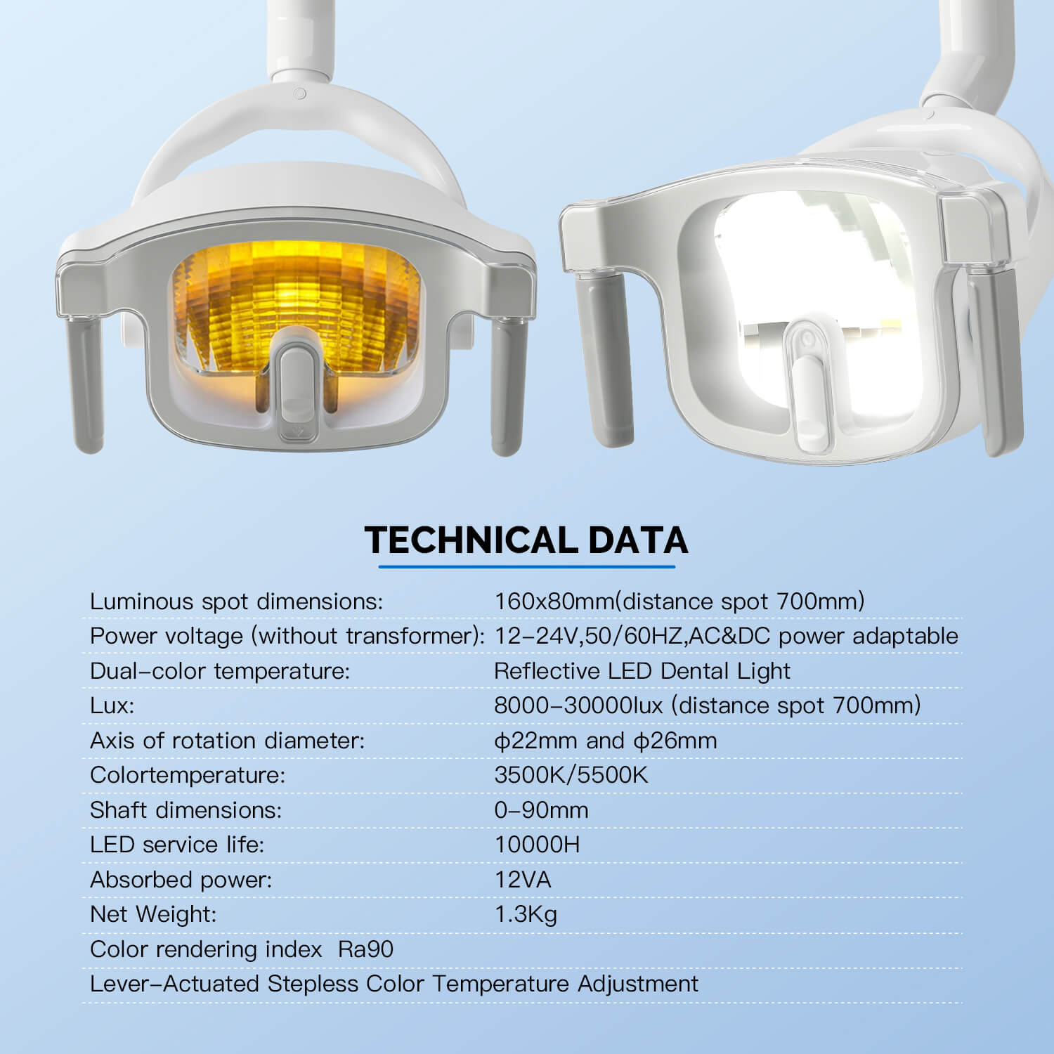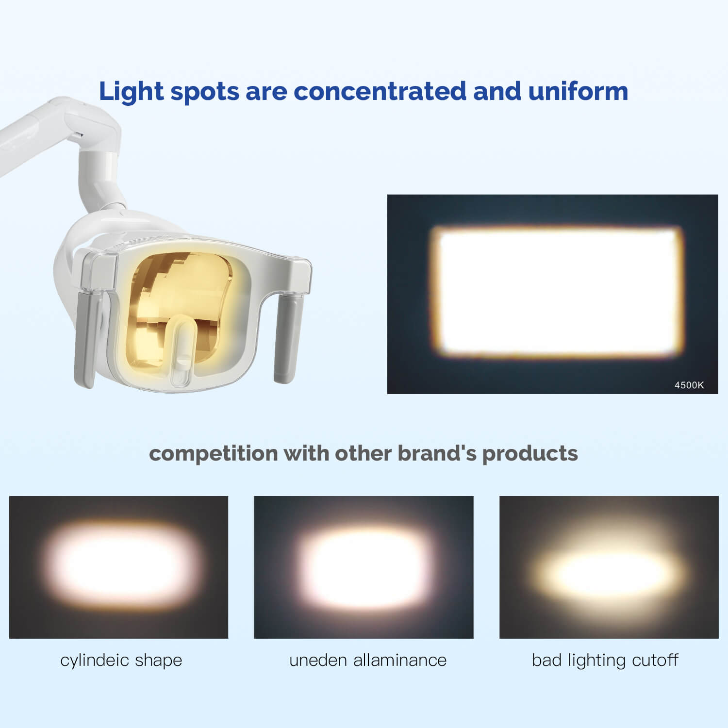 Dental Unit Chair Reflective LED Oral Light 12W. Infrared sensor switch energy-saving and convenient. Arbitrary angle adjustment. Light spots are concentrated and uniform. Color rendering index ≥ 90. 8-level adjustable brightness.