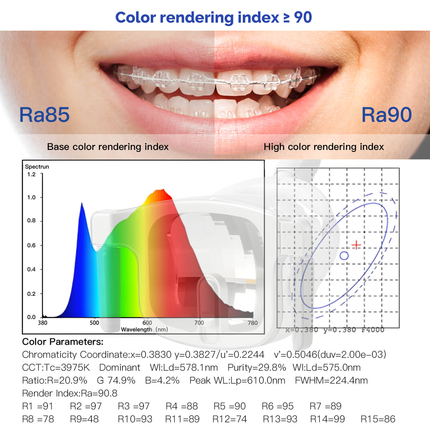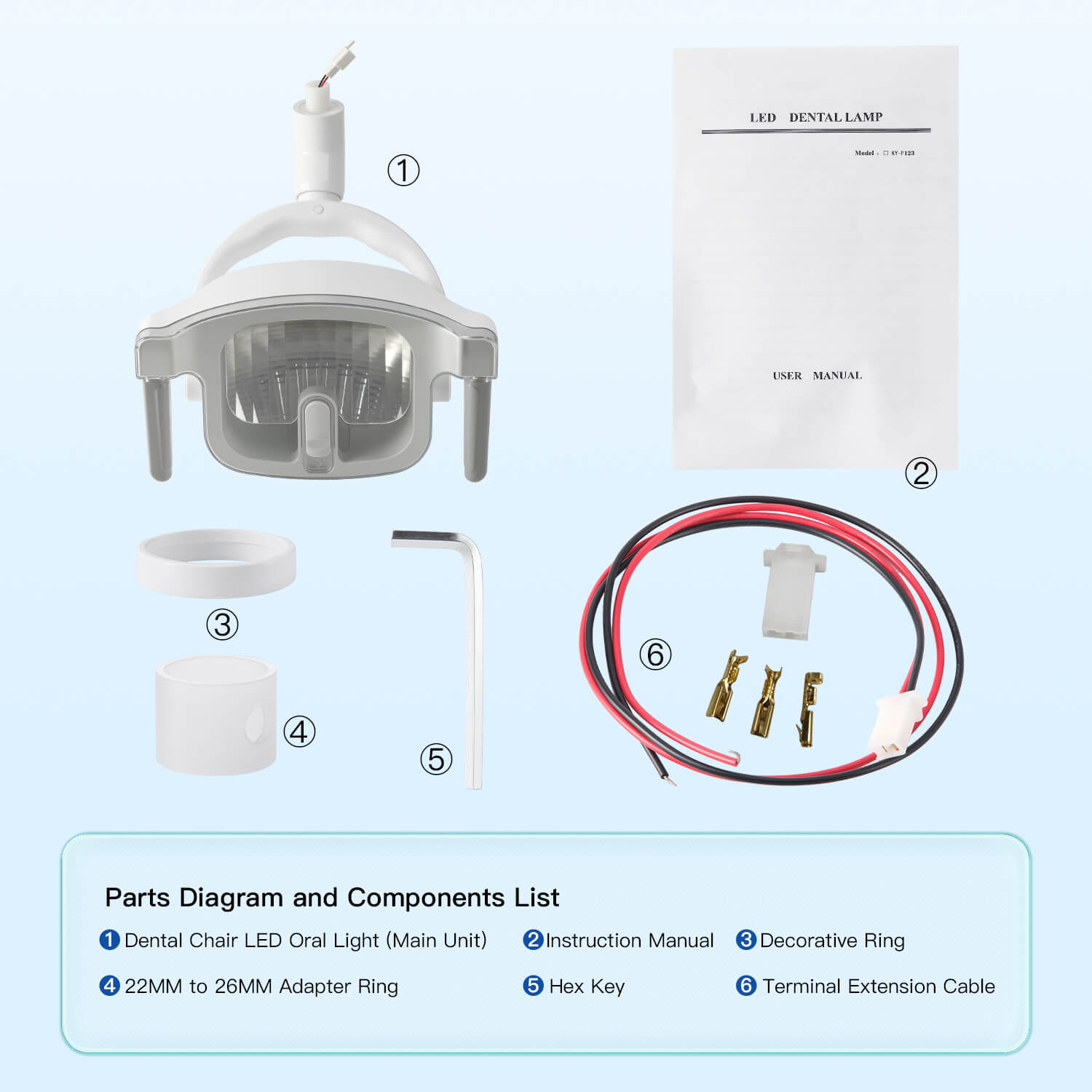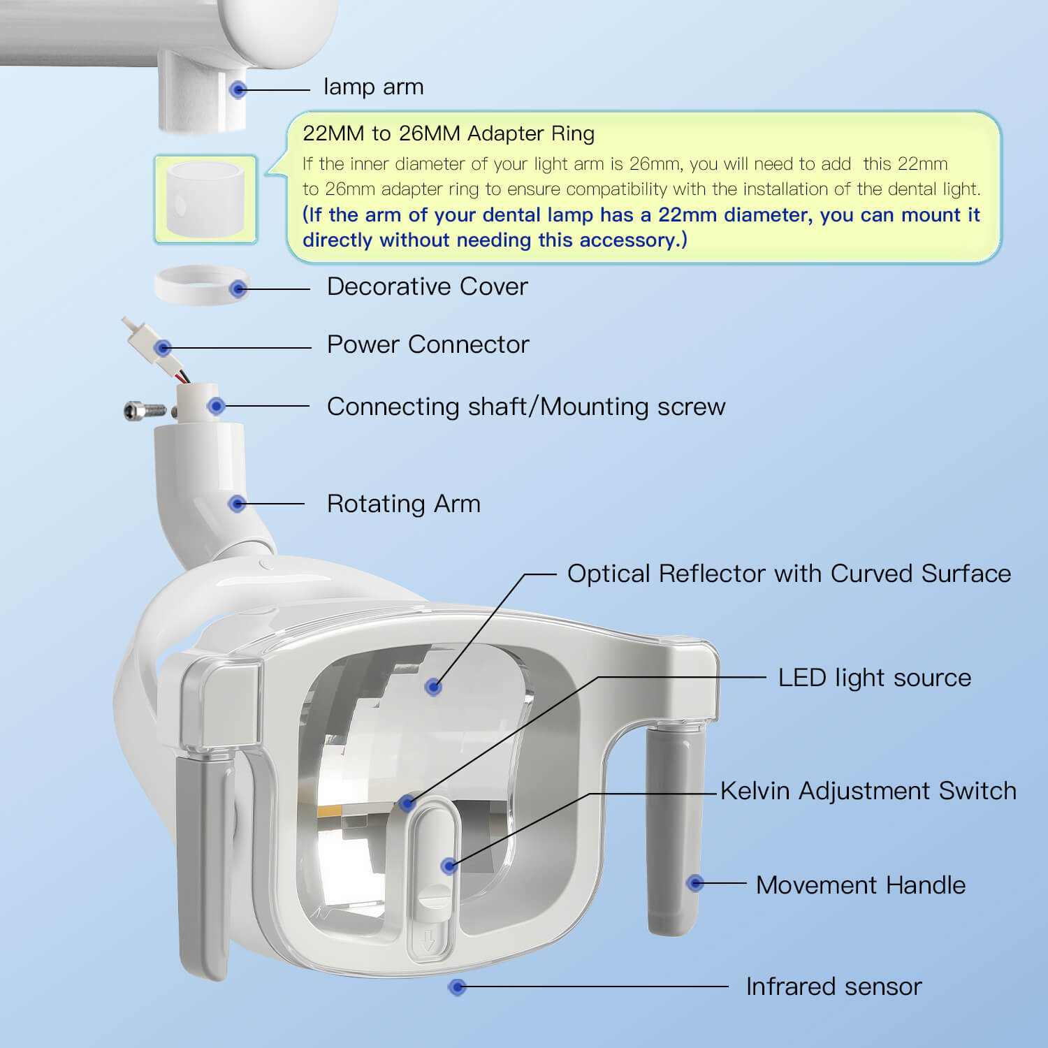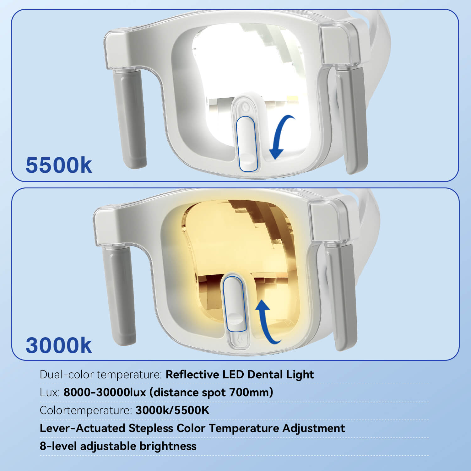 Dental Unit Chair Reflective LED Oral Light 12W. Infrared sensor switch energy-saving and convenient. Arbitrary angle adjustment. Light spots are concentrated and uniform. Color rendering index ≥ 90. 8-level adjustable brightness.