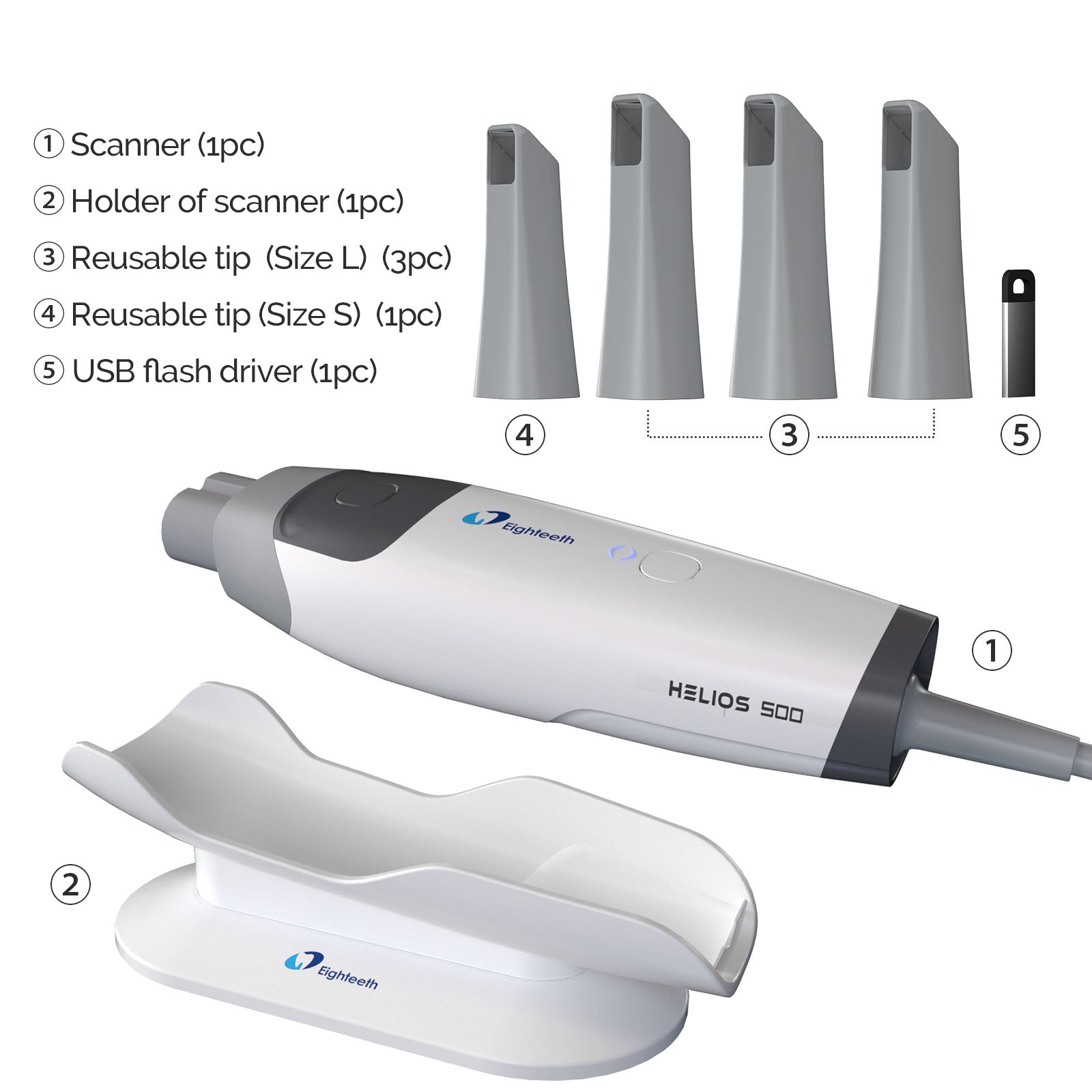 Eighteeth Dental Intraoral Scanner Helios 500. Includes 3 large and 1 small anti-fogging tips. The Dental Scanner is designed for ease of use, featuring software that is simple and self-developed. Easy to Use with AI Technology.