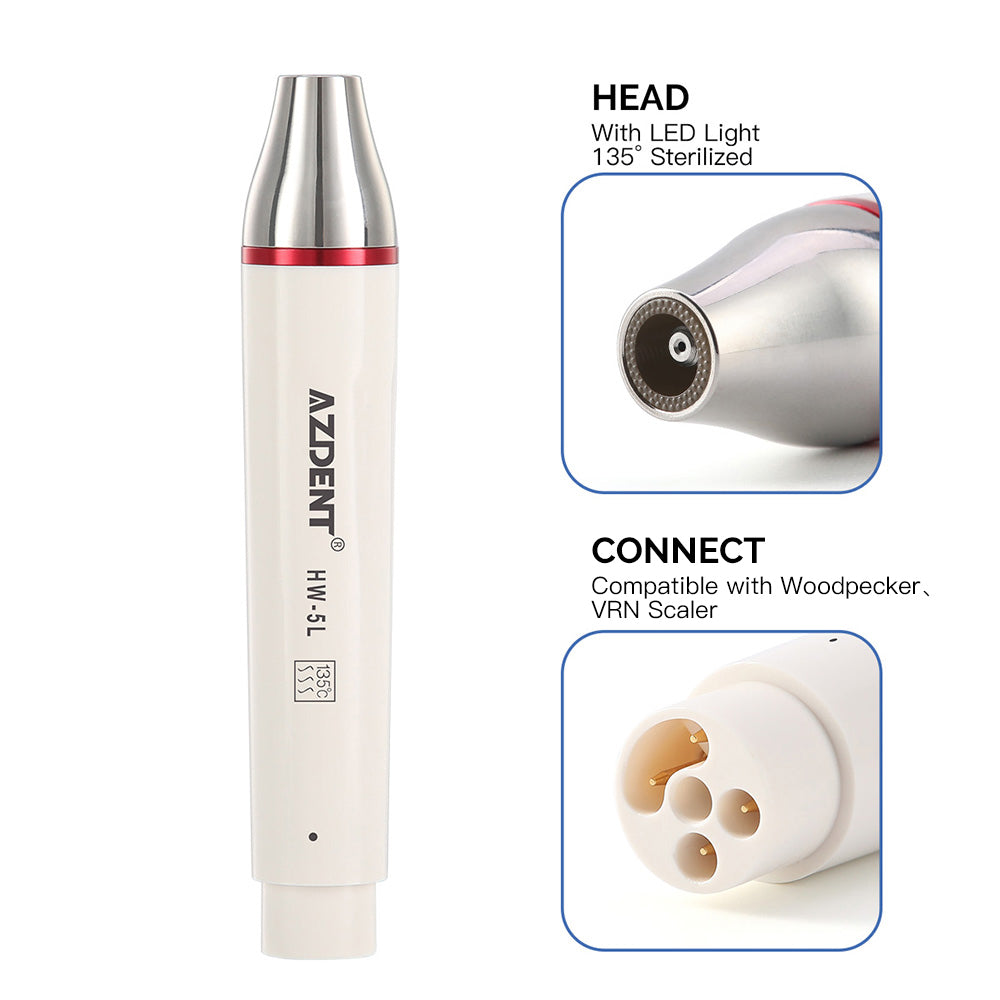 Dental LED Ultrasonic Scaler Piezo Handpiece HW-5L Upgraded. Compatible with Woodpecker, VRN Scaler. With upgraded LED light and metal. Body with anti-skid groove, more comfortable to hold. 135℃ High Temperature Sterilization.