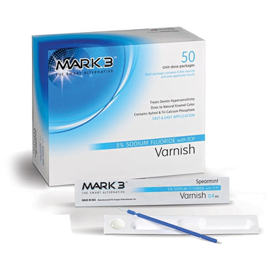 MARK3 5% Sodium Fluoride Varnish with TCP Bubble Gum/Spearmint/Caramel Flavor 50/box. 3 Flavors : Spearmint, Caramel, Bubble Gum. MARK3 varnish 5% sodium fluoride with TCP 50/box is a convenient fluoride treatment containing tricalcium phosphate, which helps remineralize teeth.