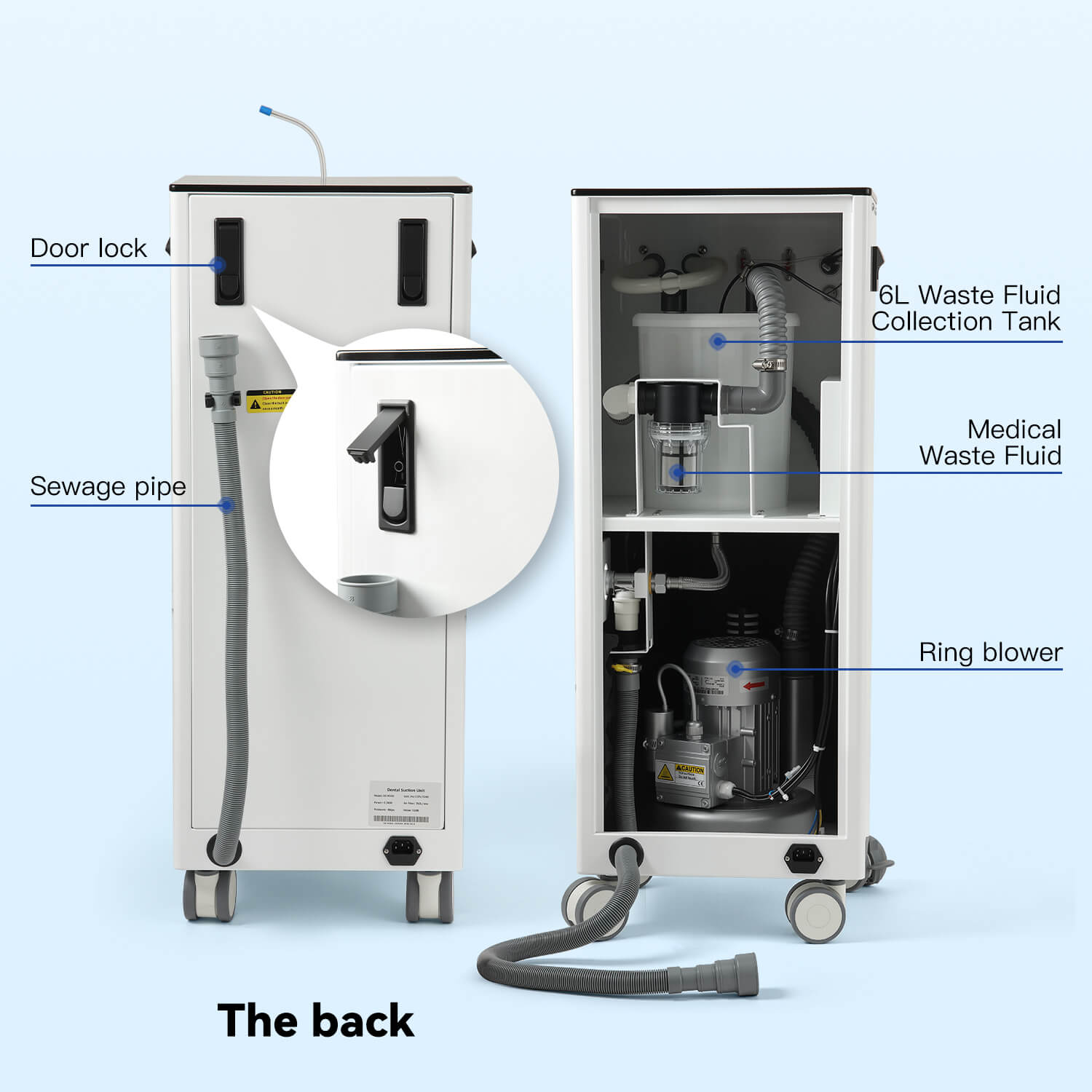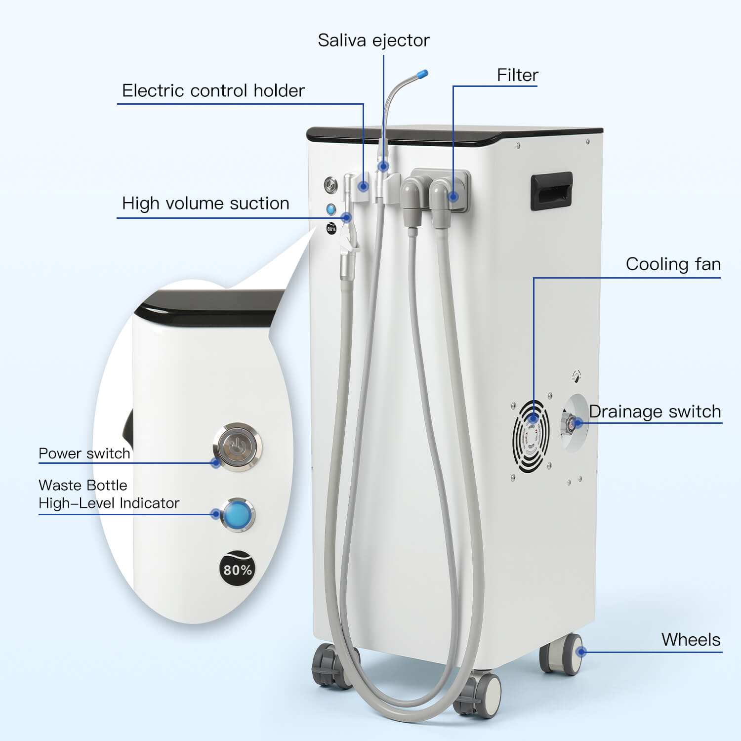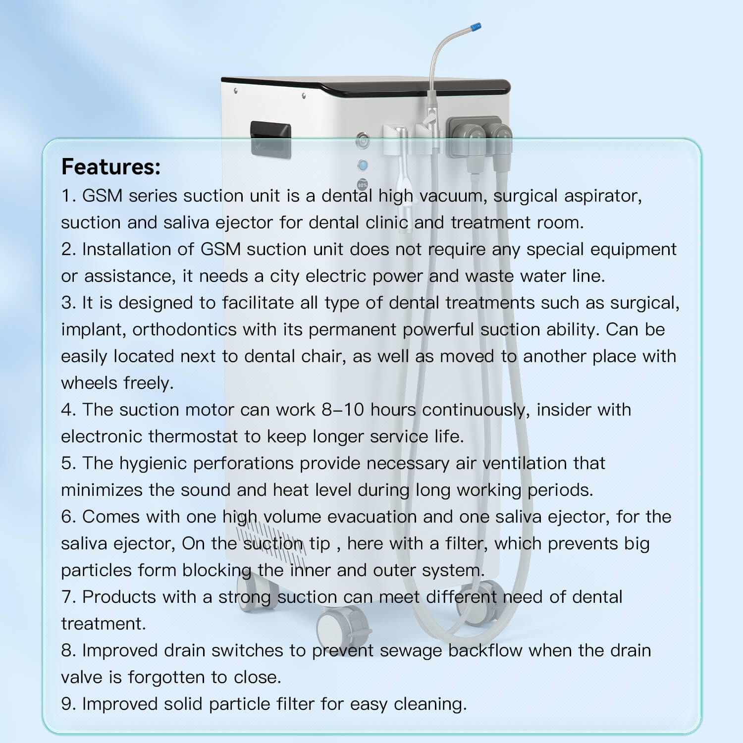 Mobile Dental Vacuum Suction Systems Unit GS-M400 Plus High Suction Pump. 400W. It is designed to facilitate all type of dental treatment such as surgical, implant, orthodontics with its permanent powerful suction ability. Can be easily located next to dental chair, as well as moved to another place with wheels freely. The suction can work 8-10 hours continuously, inside with electronic thermostat to keep longer service life. The hygienic perforations provide necessary air ventilation, so that the sound and heat level can be minimized during long working periods. The mobile suction comes with one high volume evacuation and one saliva ejector, for the saliva ejector, on the suction tip, here with a filter, which prevents big particles from blocking the inner and outer system.