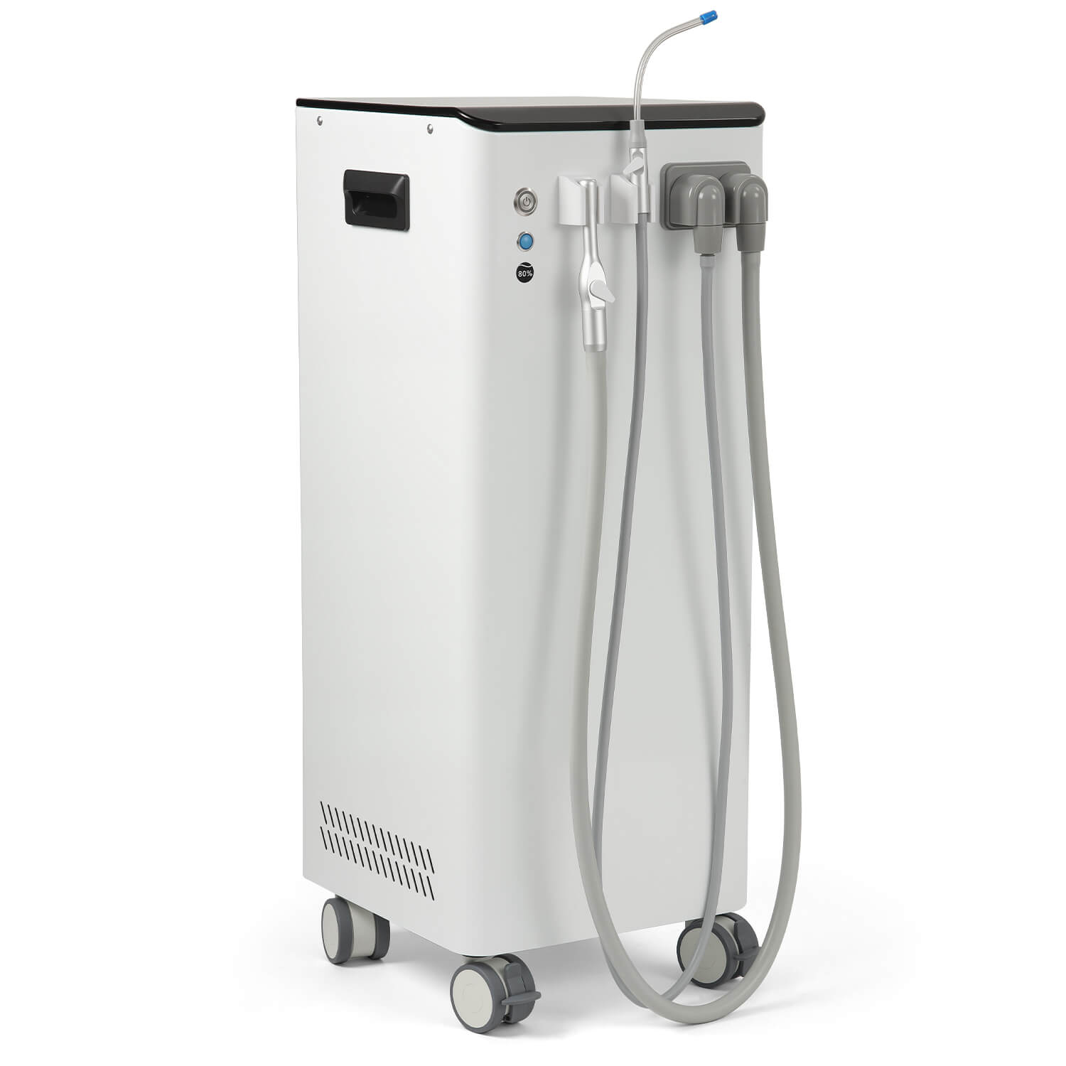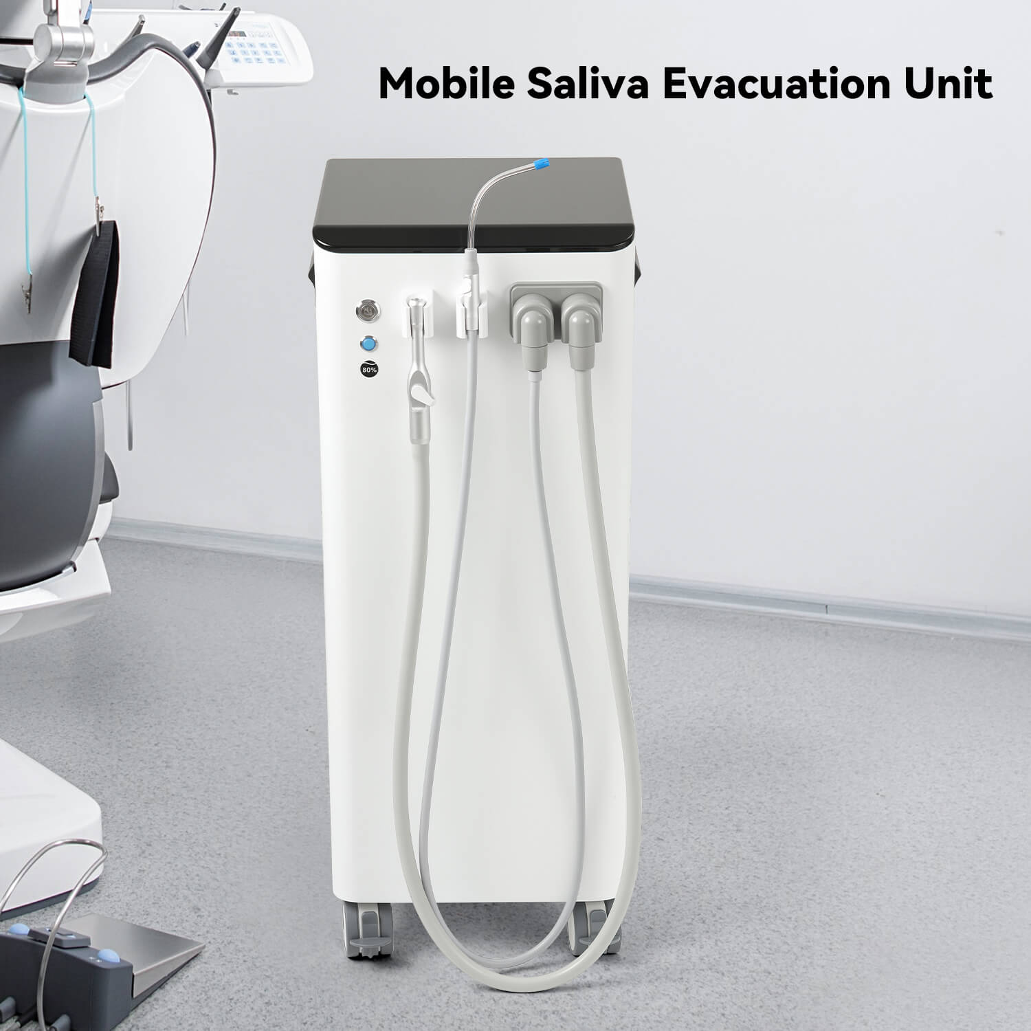 Mobile Dental Vacuum Suction Unit Systems. High Suction Pump. 300W/400W. This product features a plug-in pre-filter for easy cleaning and a double fuse socket for added safety. The handles make it easily transportable and the imported acrylic sheet ensures durability and minimal color fading. With liquid level markings and the ability to work continuously for 8-10 hours, this vacuum suction unit is designed to facilitate all types of dental treatments while also minimizing excess sound and heat.