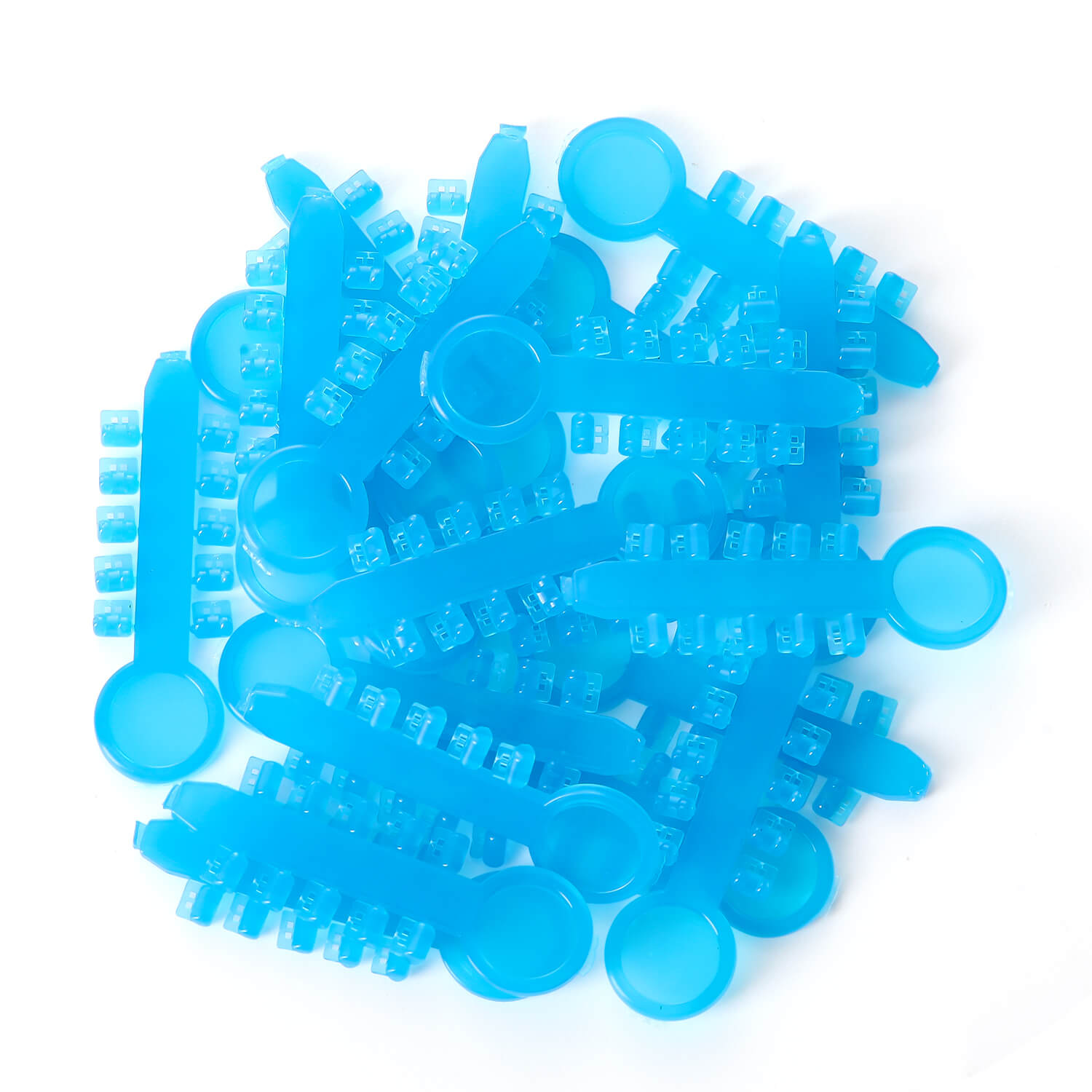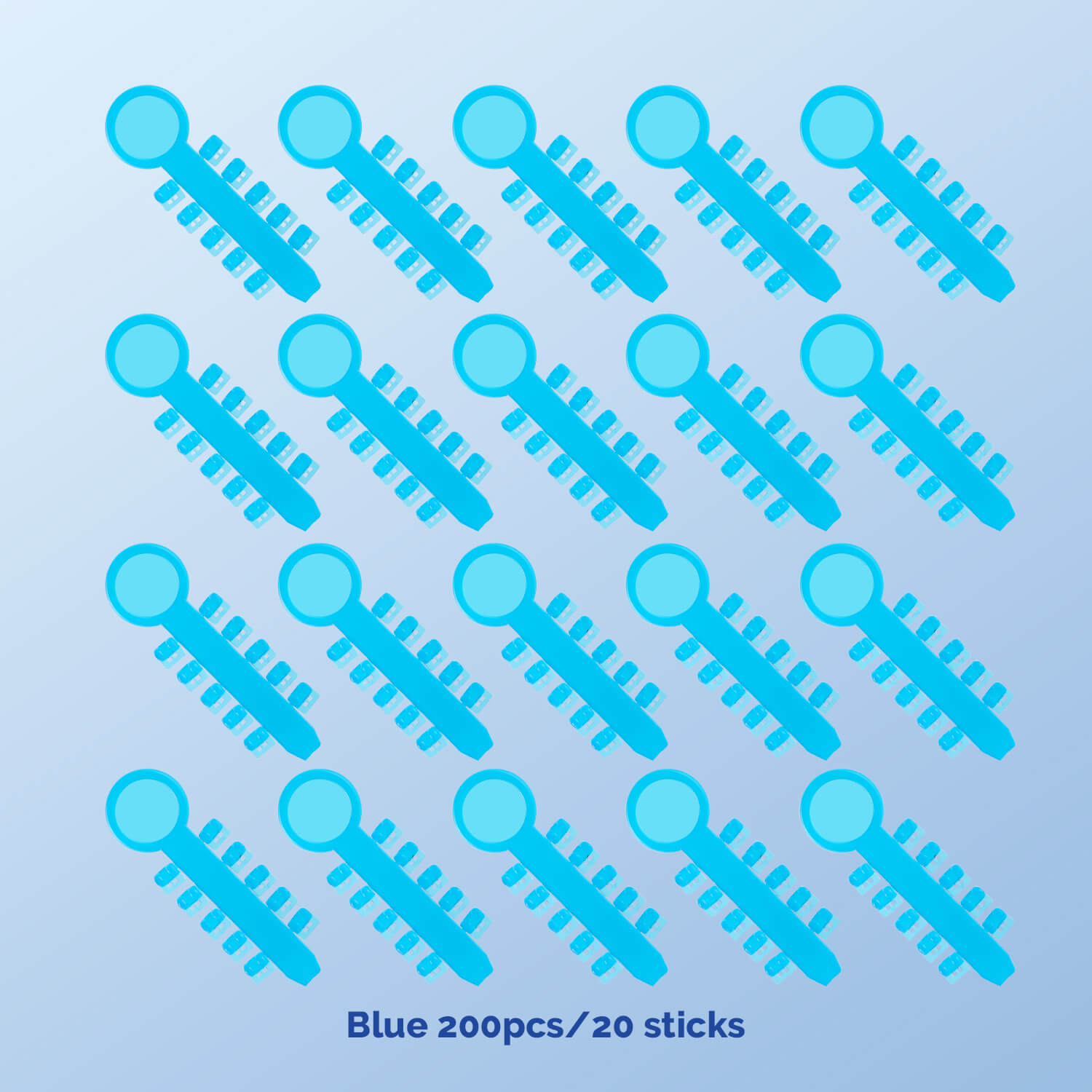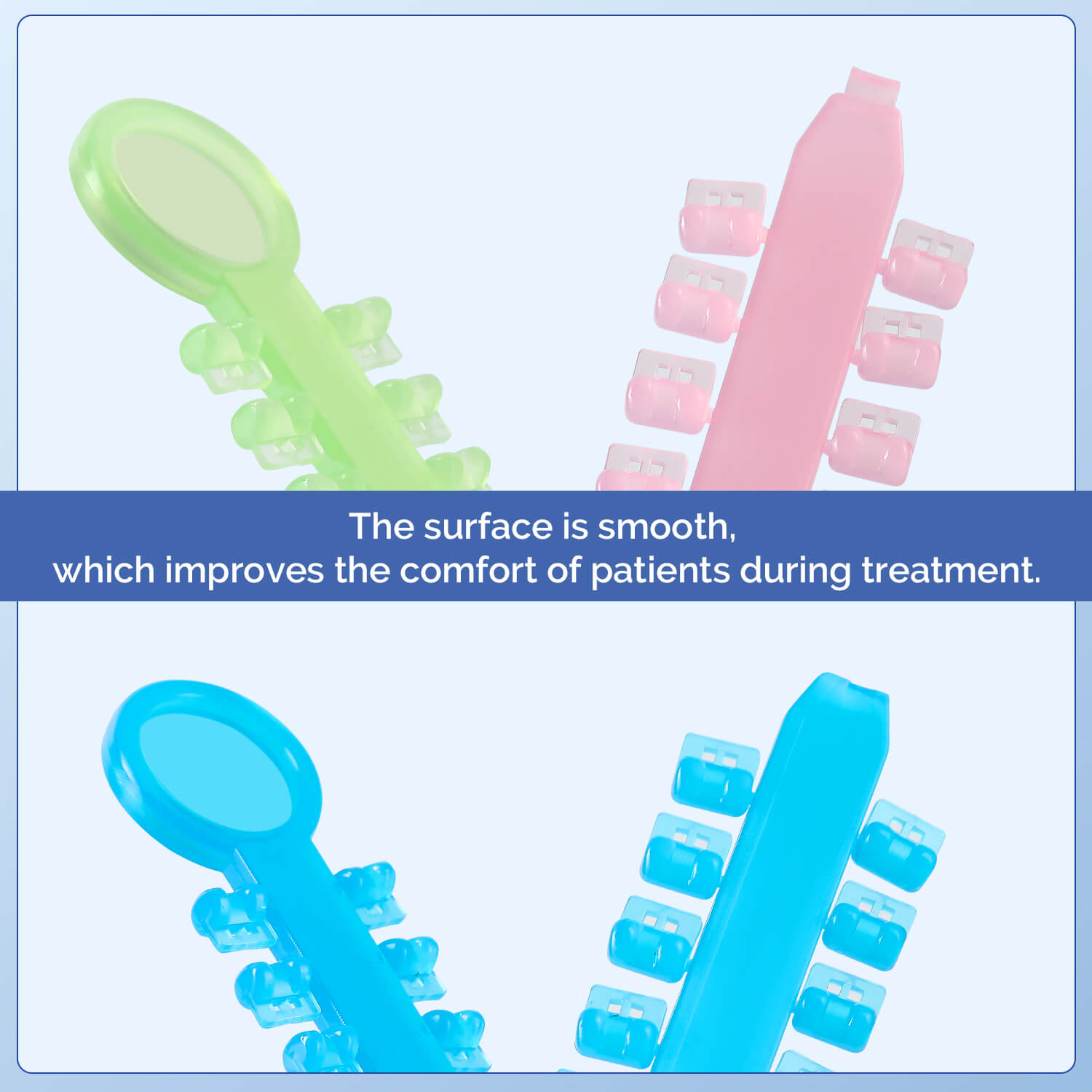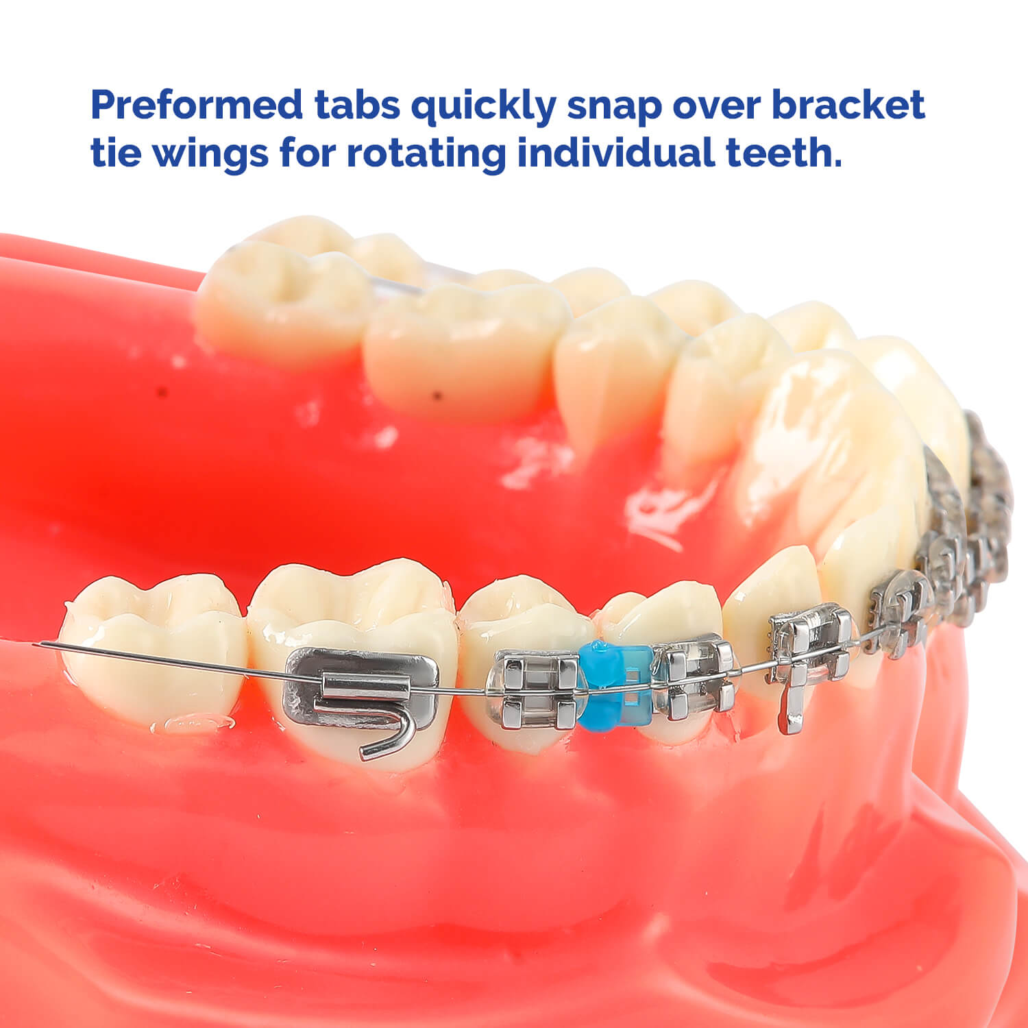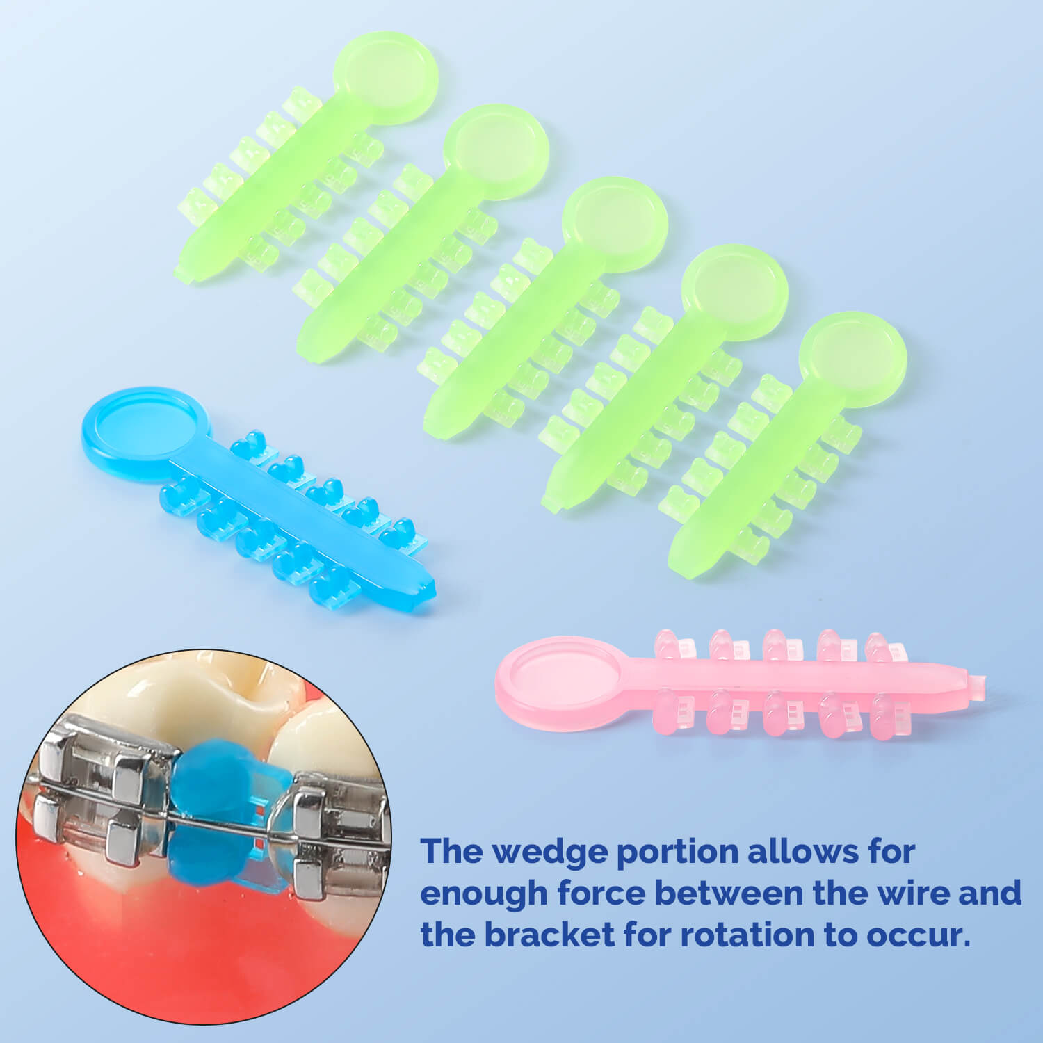 Dental Orthodontic Rotary Wedges Elastic Rotary Pads 200pcs/Bag. 10pcs/stick, 20sticks/pack. The surface is smooth, which improves the comfort of patients during treatment. Preformed tabs quickly snap over bracket tie wings for rotating individual teeth. The wedge portion allows for enough force between the wire and the bracket for rotation to occur.