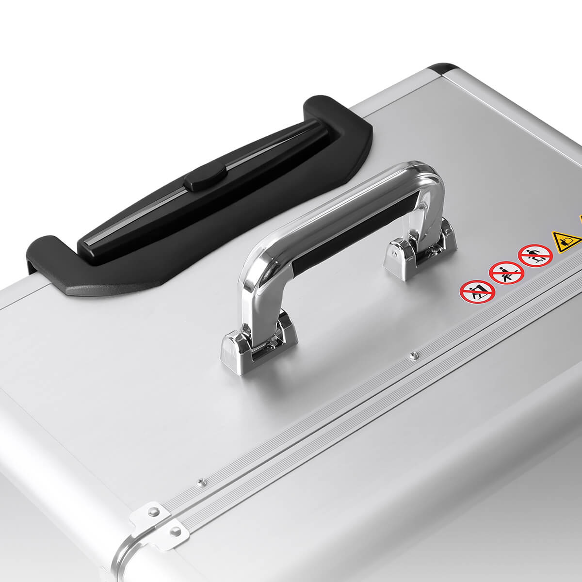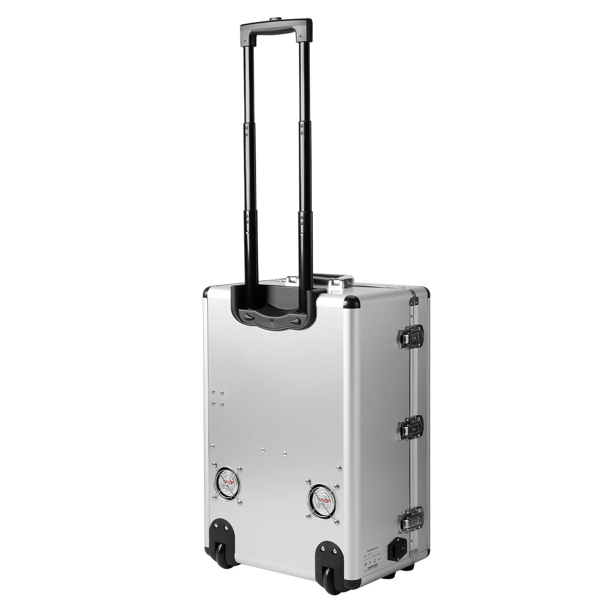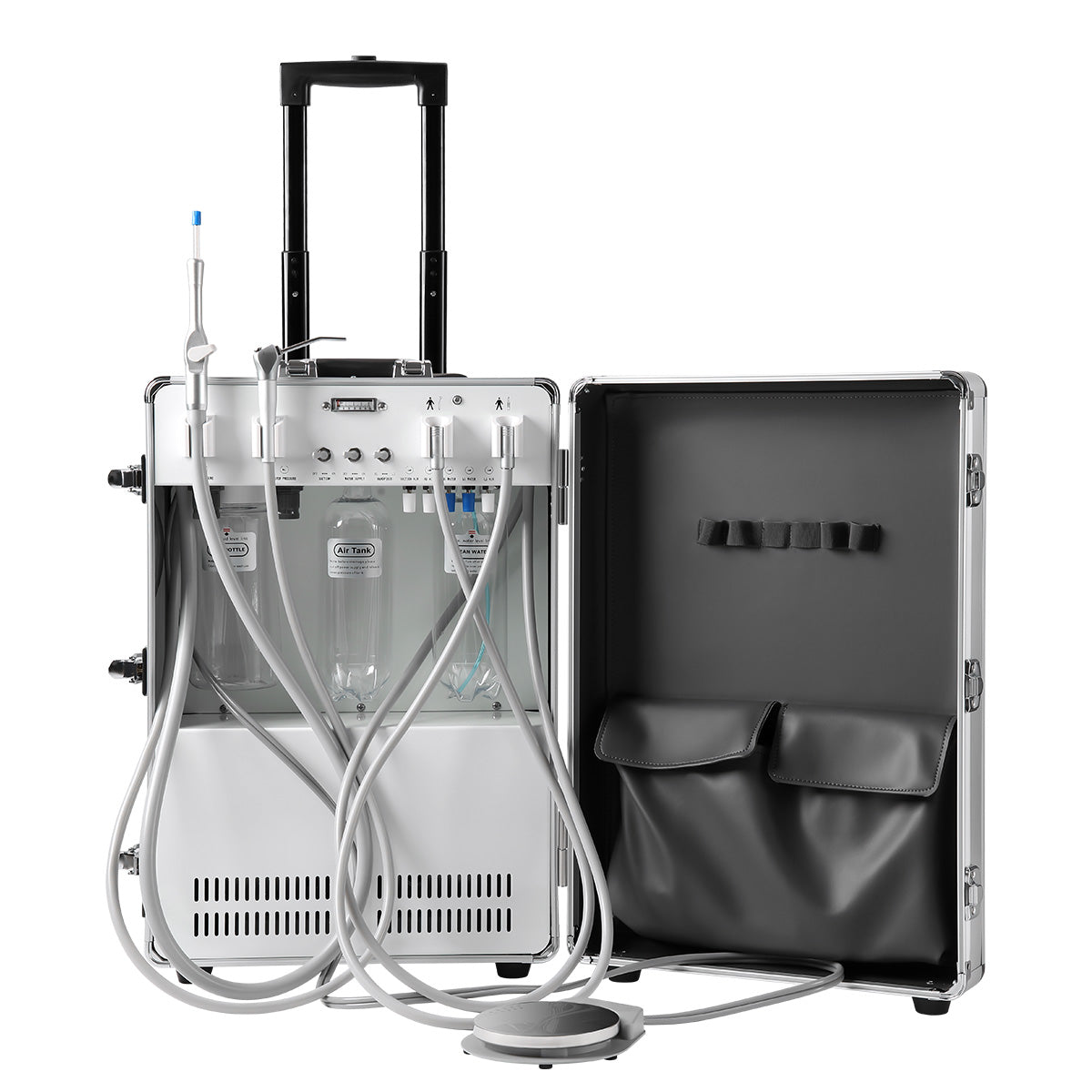 Dental Portable Mobile Delivery Unit System Built-in Air Compressor Strong Suction 4 Hole. The shell of the product is made of silver high-strength aluminum box. Easy to Carry and Move. Compact and Space-Saving. Simple to Operate. Steady Performance. Fully Functional.