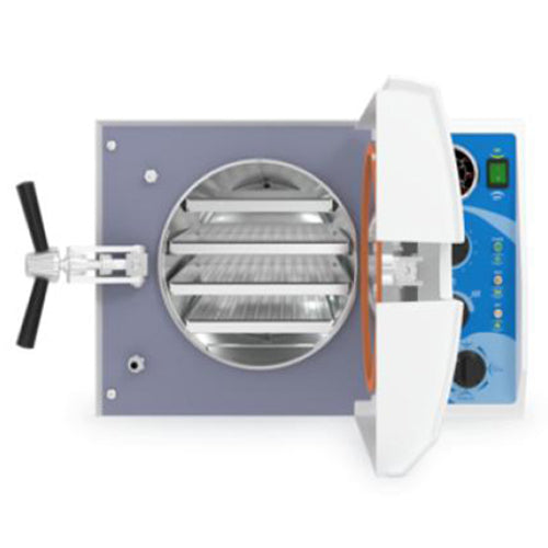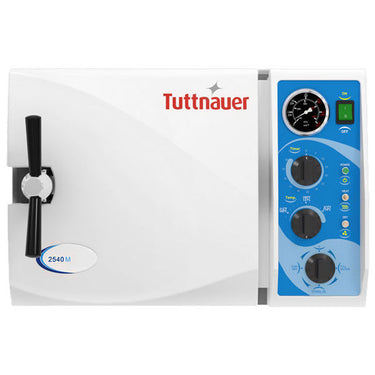 Tuttnauer 2540M Manual Autoclave with Chamber 10"x19" Volume 6 Gal/23 L. Automatic shut off at the end of both the sterilization and dry cycles. A long life electro polished chamber and door. Double safety locking device prevents door from opening while chamber is pressurized. Drain valve is located on the front, allowing for quick and easy draining of water reservoir. Dual safety thermostat to protect against overheating. Standard unwrapped cycle Hot start: 14 min, Cold Start 30 min. Cycle times are approximate and may vary depending on instrument loads. FDA Approved.