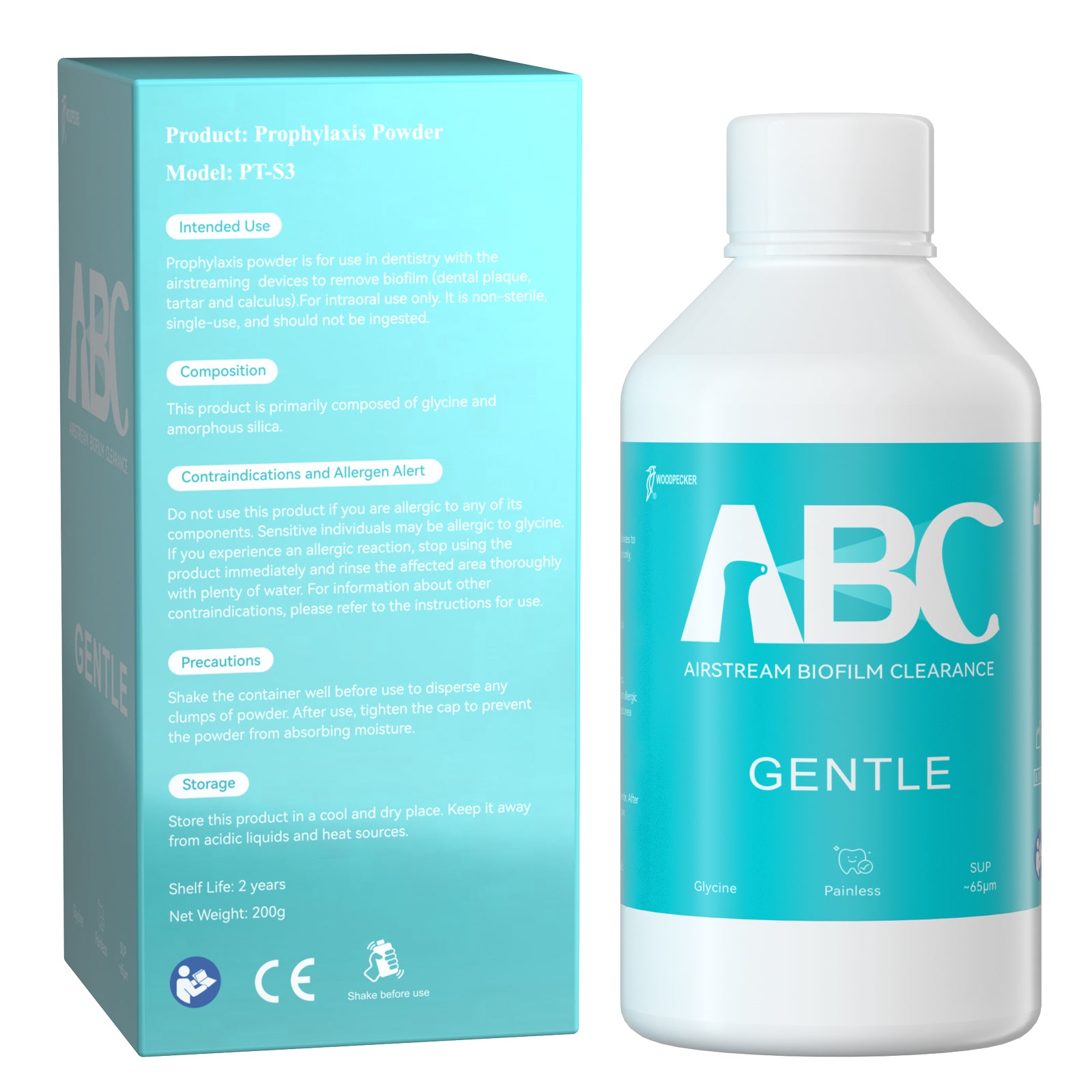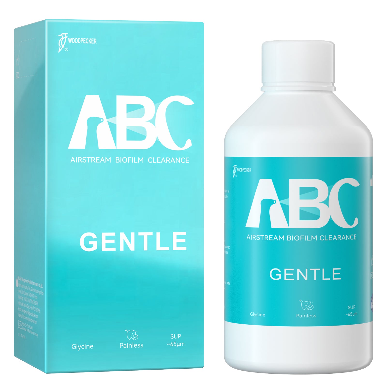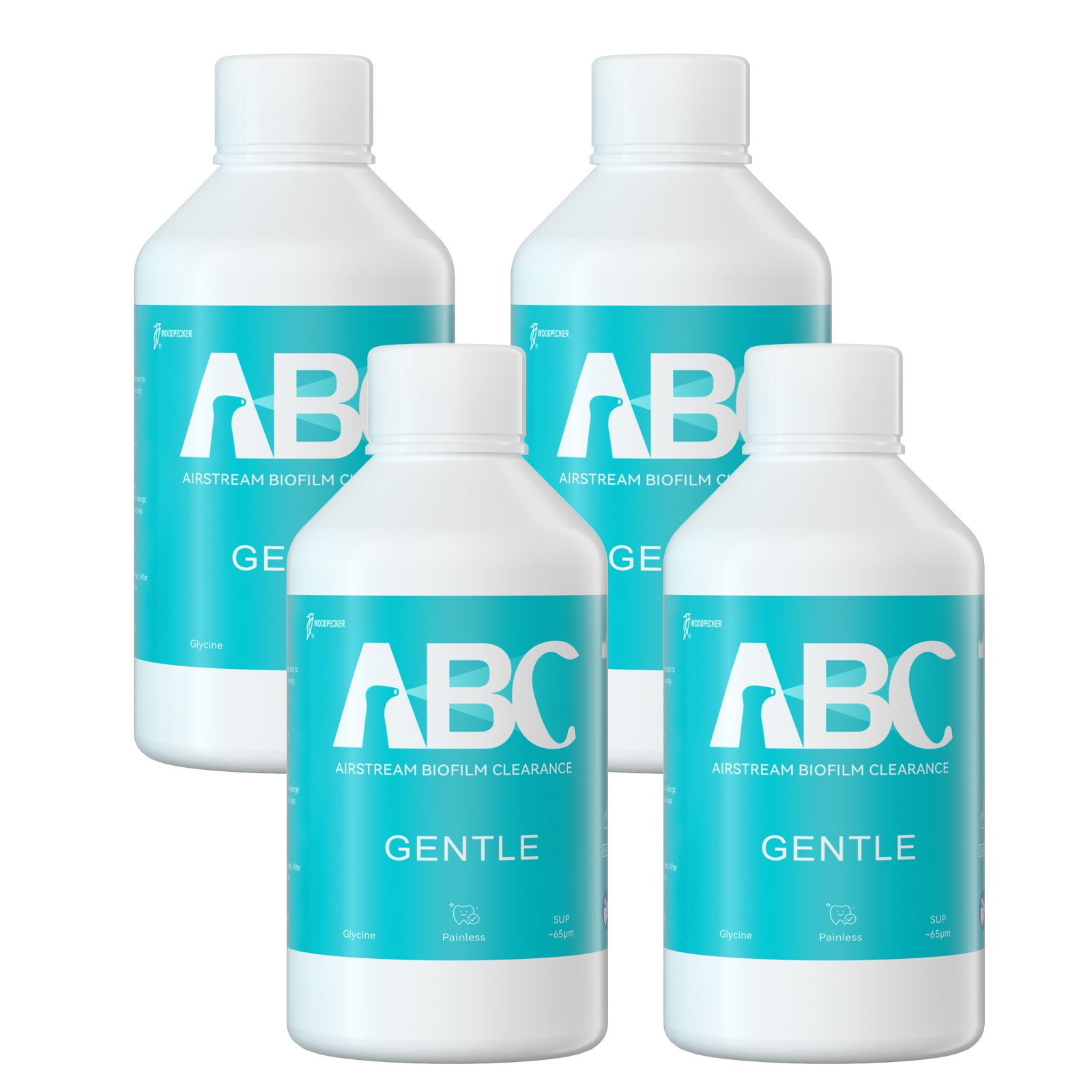 Woodpecker Prophy Air Polisher Prophylaxis Powder 65um Glycine for Supragingival Scaling #GENTLE 4 Bottle/Unit. Used for removal of biofilm and soft dirt on the adult gingival. Suitable for patients choosing painless tooth scaling, return visit patients, sensitive patients and orthodontic patients. Pleasant taste and gentle treatment.